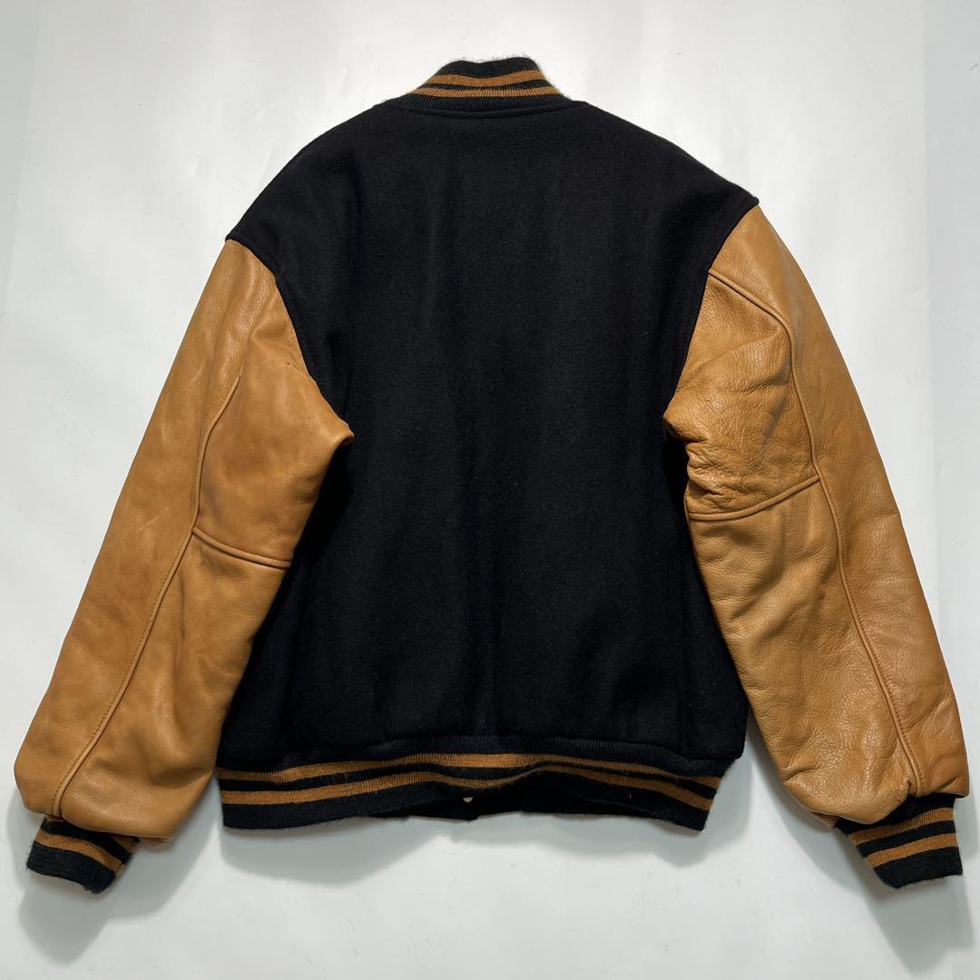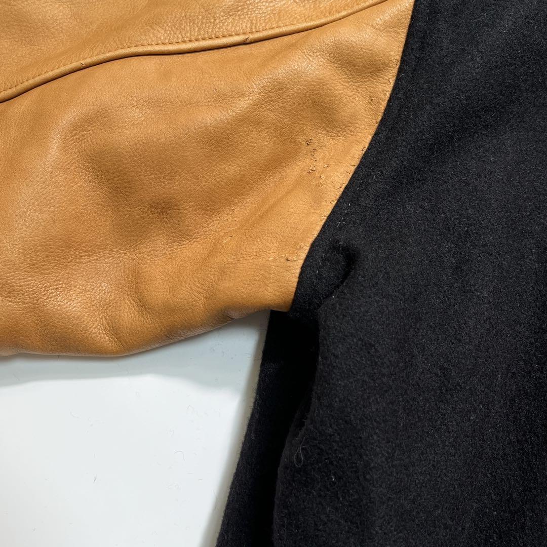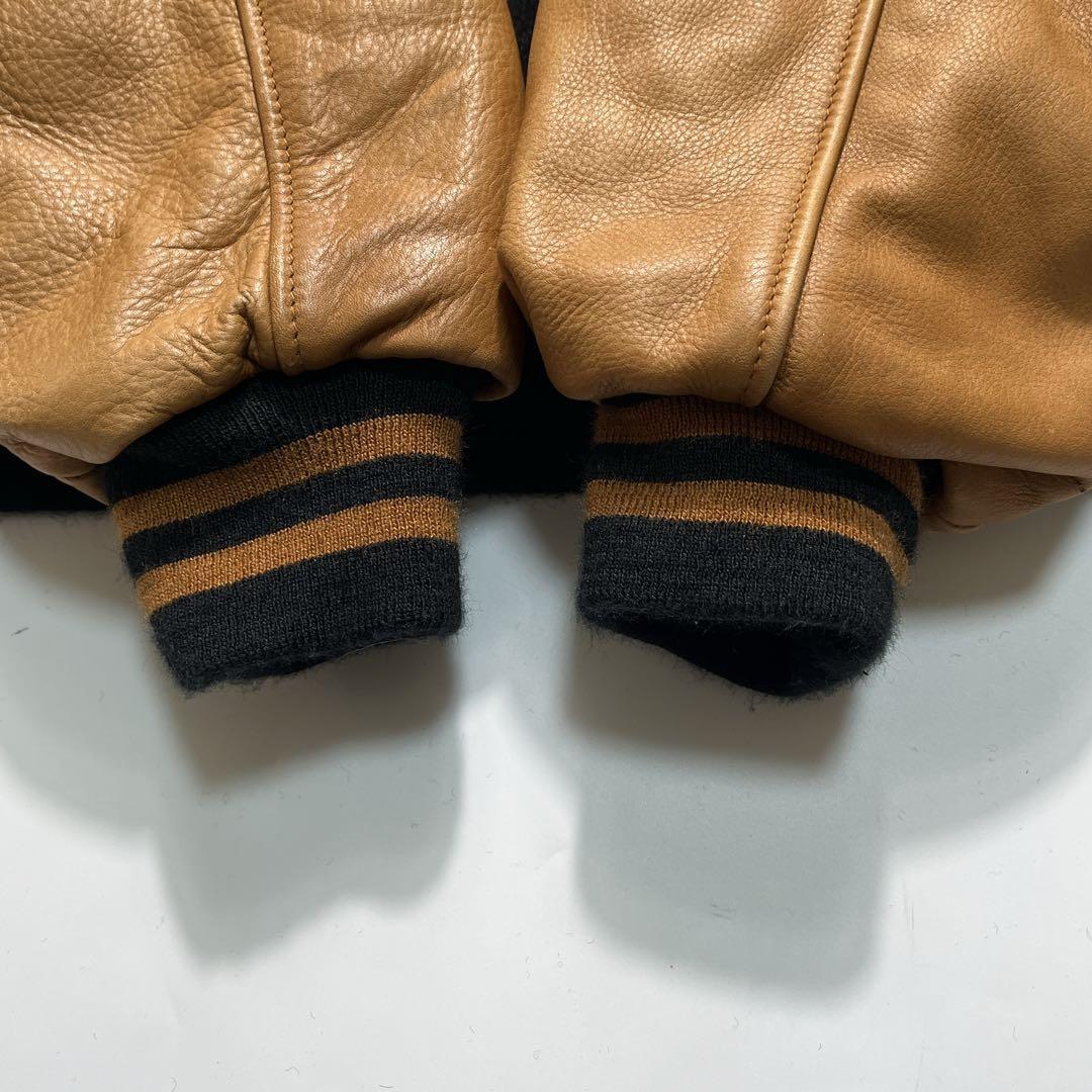 スタジアムジャケット。ブラックのボディにキャメル系の