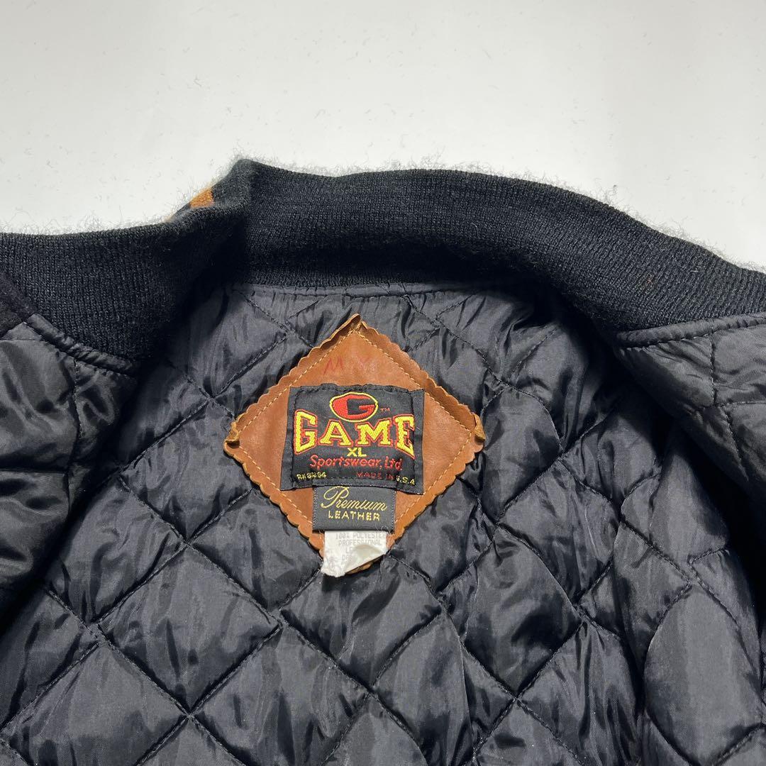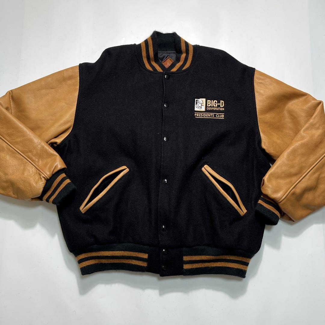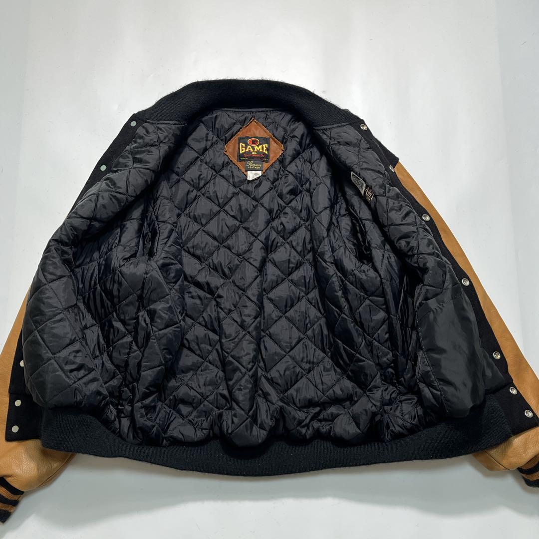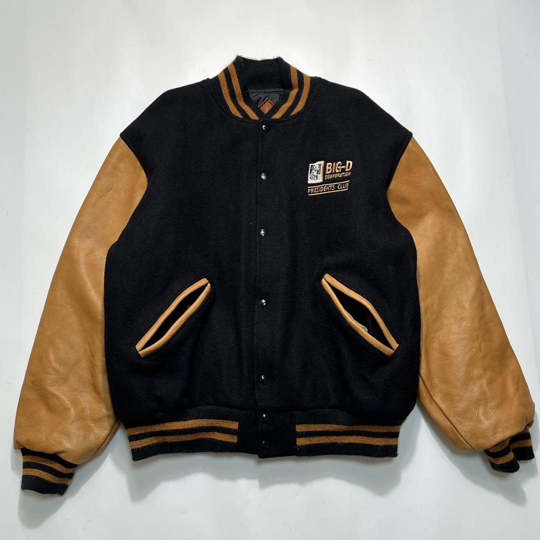 スタジアムジャケット。ブラックのボディにキャメル系の