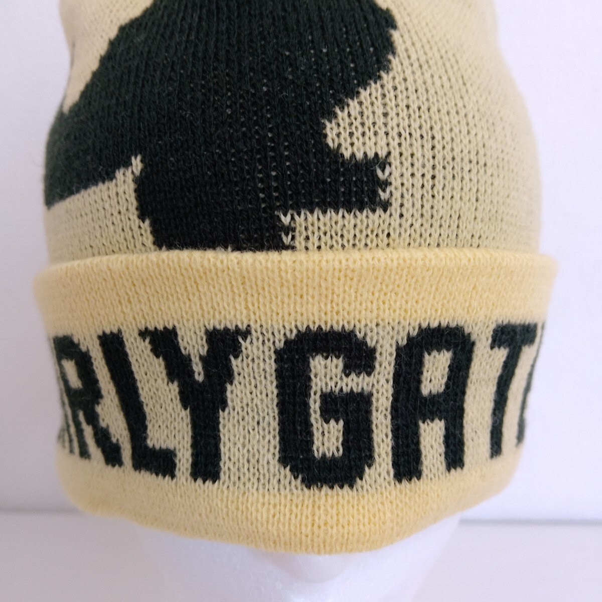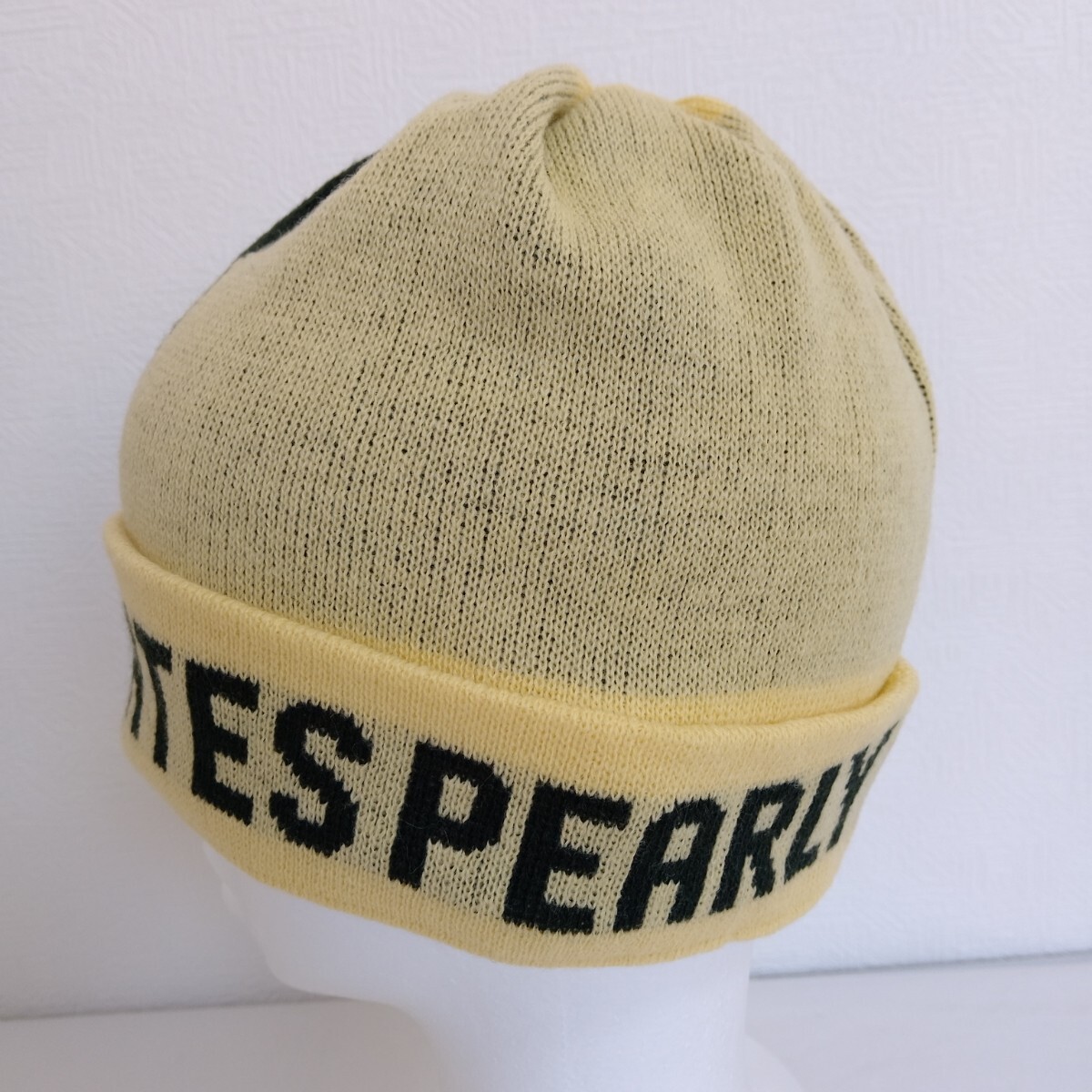 PEARLY GATES ニット帽です、色は黄色/黒、フロントに黒の『PEARLY GATES』の編み込、頭部分には黒の恐竜デザインの編み込がデザインされています。