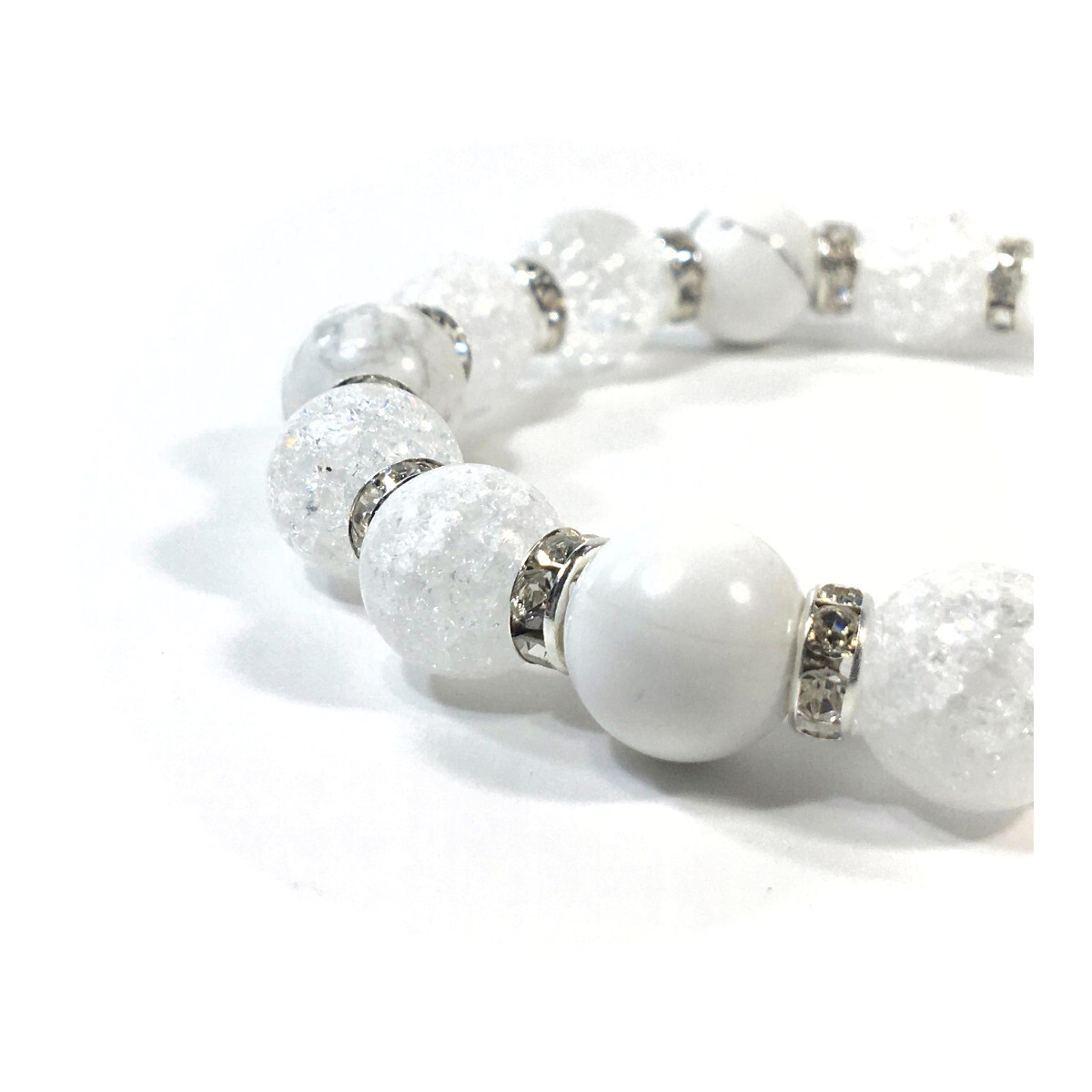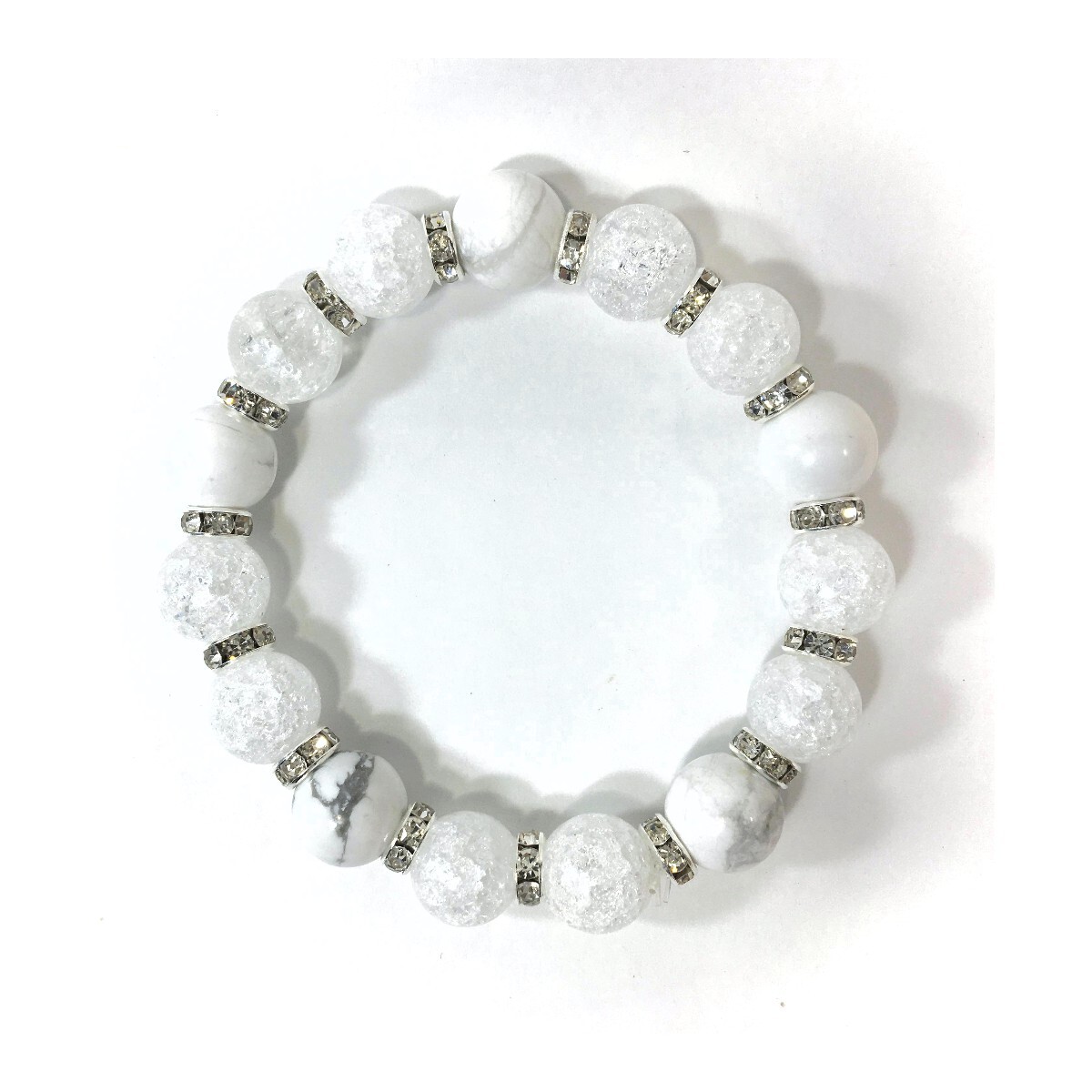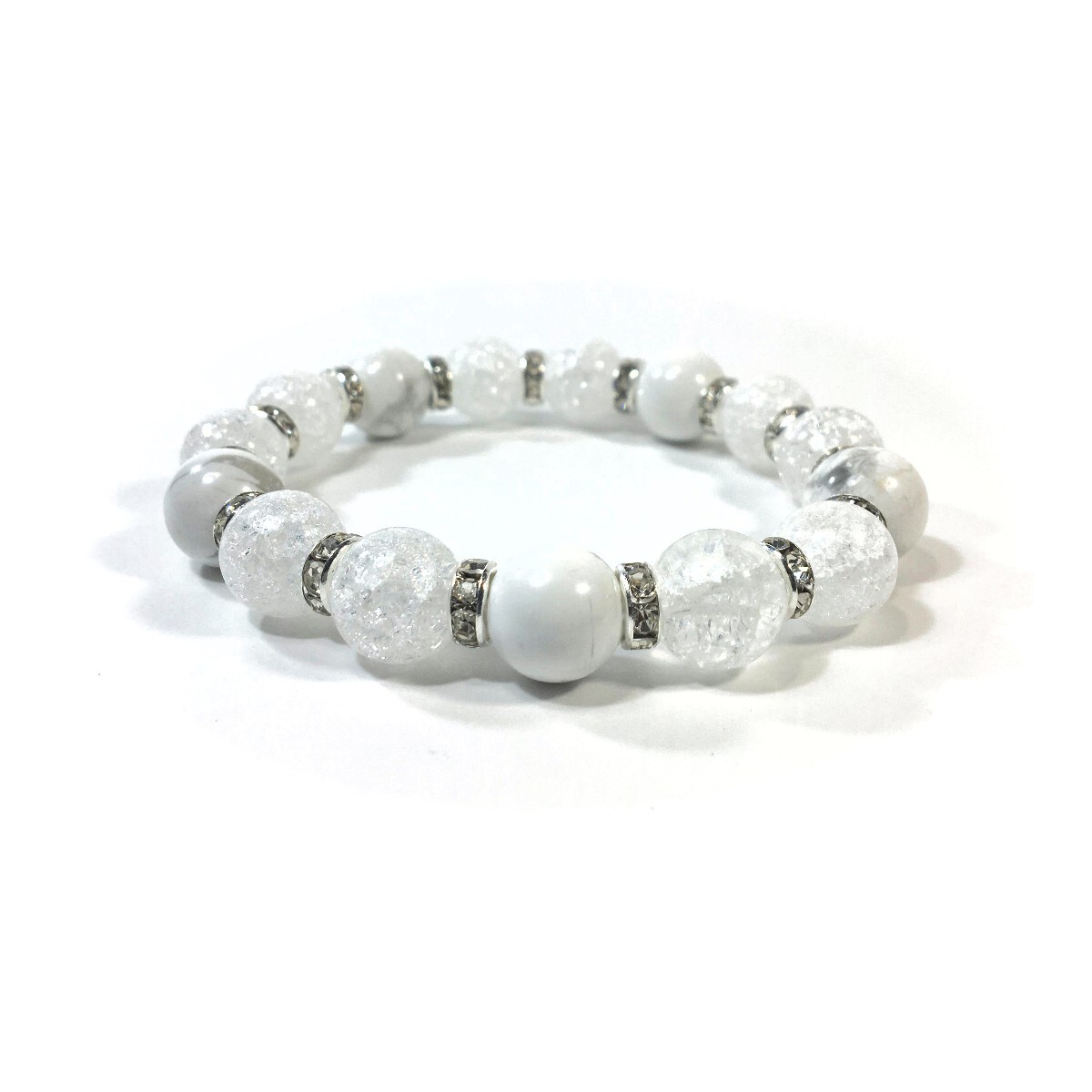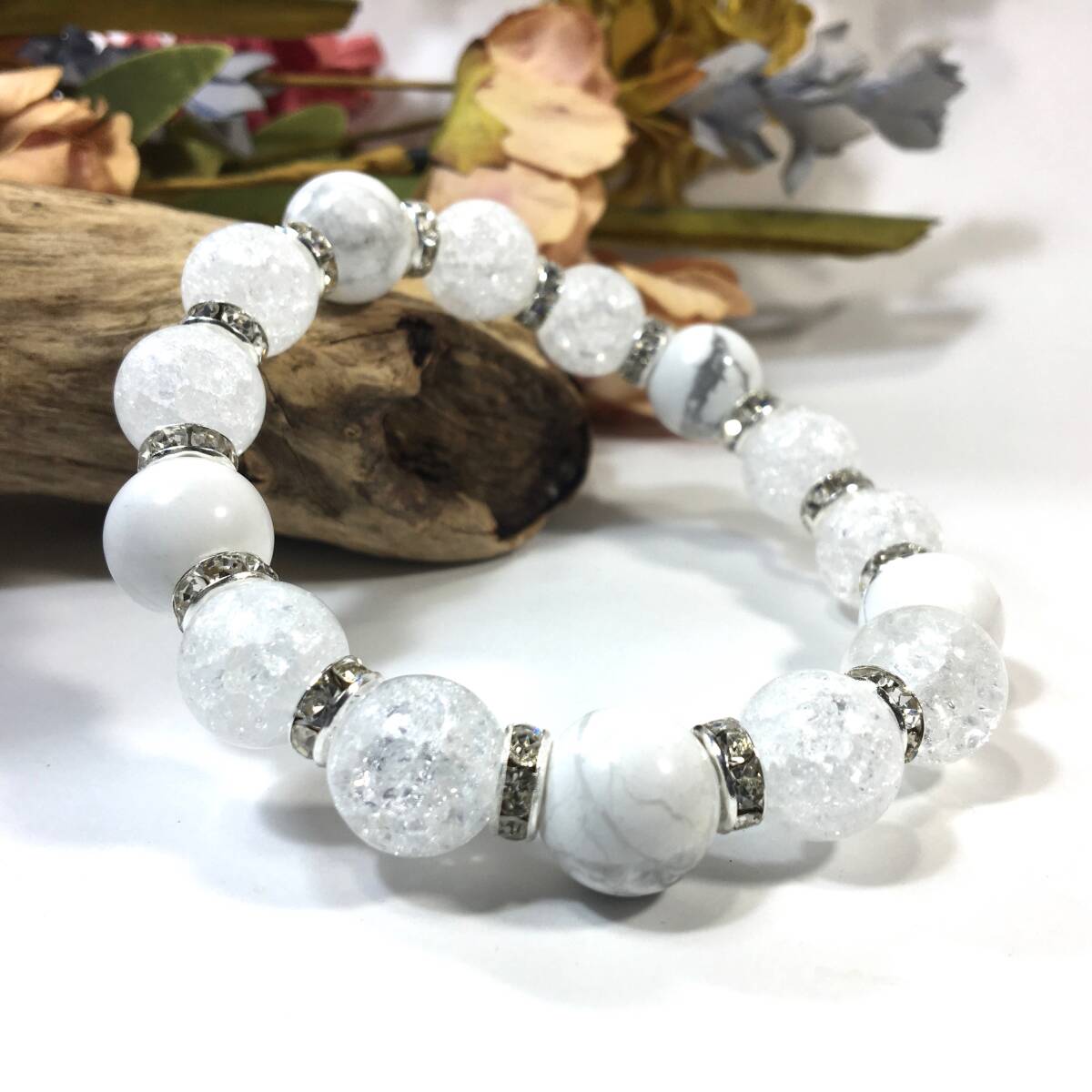 こちらは、クラック水晶とハウライトを組み合わせたパワーストーンブレスレットです。間にはロンデルを挟み高級感あるデザインに仕上げております。石大きさは12mm玉を使用して内径約18cmです。気になる方は是非この機会にどうぞ。