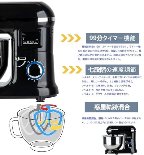 スタンドミキサー 5.5L大容量 99分タイマー機能 三種類アタッチメント付き 七段階速度調節 低騒音設計 一台三役 「練る」「混
