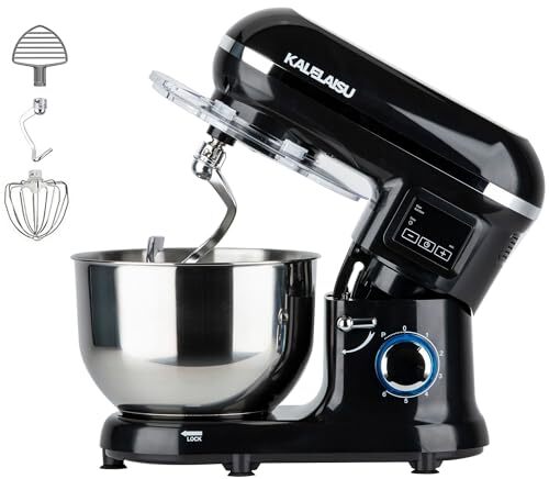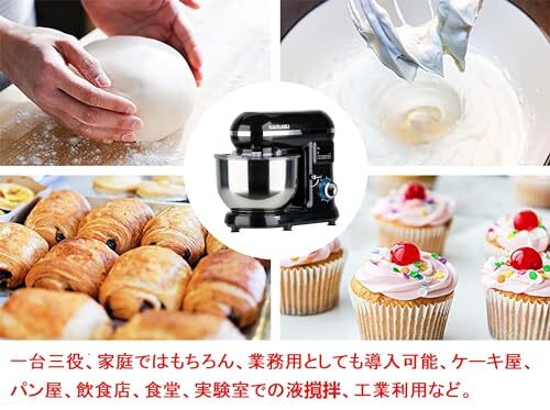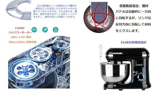 1、【製品パラメータ】5.5L大容量スタンドミキサー,三種類のアタッチメント付き:平面ビーター、ドゥーフック、ワイヤーホイップ。1200Wハイパワーモーター、一回最大1.2-1.5kg小麦粉調理可能。日本国内での使用環境に適合。定格周波数50Hz/60Hz、定格電圧100V-110V、日本国内での使用環境に適合。60dbの低騒音設計。