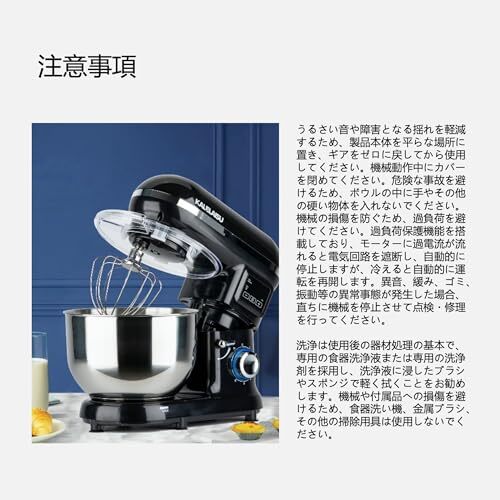 5、【注意事項】うるさい音や障害となる揺れを軽減するため、製品本体を平らな場所に置き、ギアをゼロに戻してから使用してください。機械動作中にカバーを閉めてください。危険な事故を避けるため、ボウルの中に手やその他の硬い物体を入れないでください。機械の損傷を防ぐため、過負荷を避けてください。過負荷保護機能を搭載しており、モーターに過電流が流れると電気回路を遮断し、自動的に停止しますが、冷えると自動的に運転を再開します。異音、緩み、ゴミ、振動等の異常事態が発生した場合、直ちに機械を停止させて点検・修理を行ってください。洗浄は使用後の器材処理の基本で、専用の食器洗浄液または専用の洗浄剤を採用し、洗浄液に浸したブラシやスポンジで軽く拭くことをお勧めします。機械や付属品への損傷を避けるため、食器洗い機、金属ブラシ、その他の掃除用具は使用しないでください。