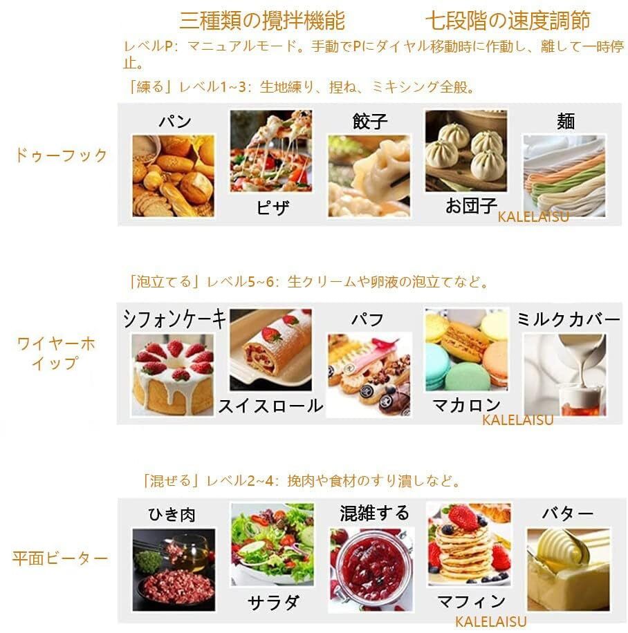 4、【7段変速・一台多役】本製品には、こねフック、泡立て器、ミキシングパドルの3つの付属品が装備されており、1〜6段変速ギアとPギア(マニュアルギア)があり、あらゆる種類の食材に適しています。こねフックは小麦粉の混合や菓子作りに適しており、速度を1~3速ギアに設定してください。ミキシングパドルは、肉の詰め物を混ぜたり、サラダを作ったりするのに適しており、速度を2〜4速ギアに設定してください。卵泡立て器は卵を泡立てたり、クリームを作ったりするのに適しており、速度を5〜6速ギアに設定してください。