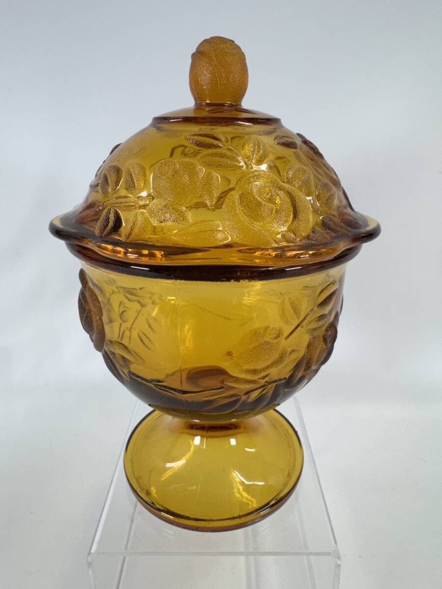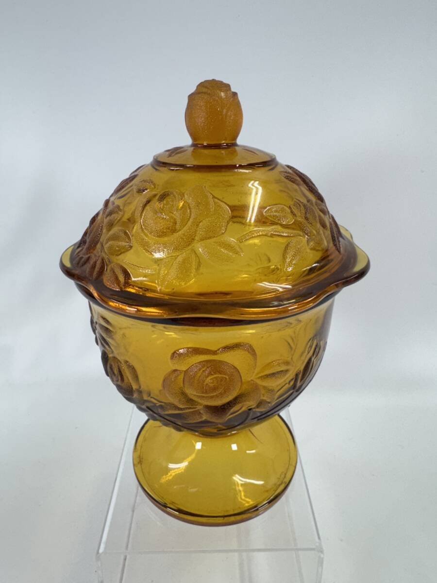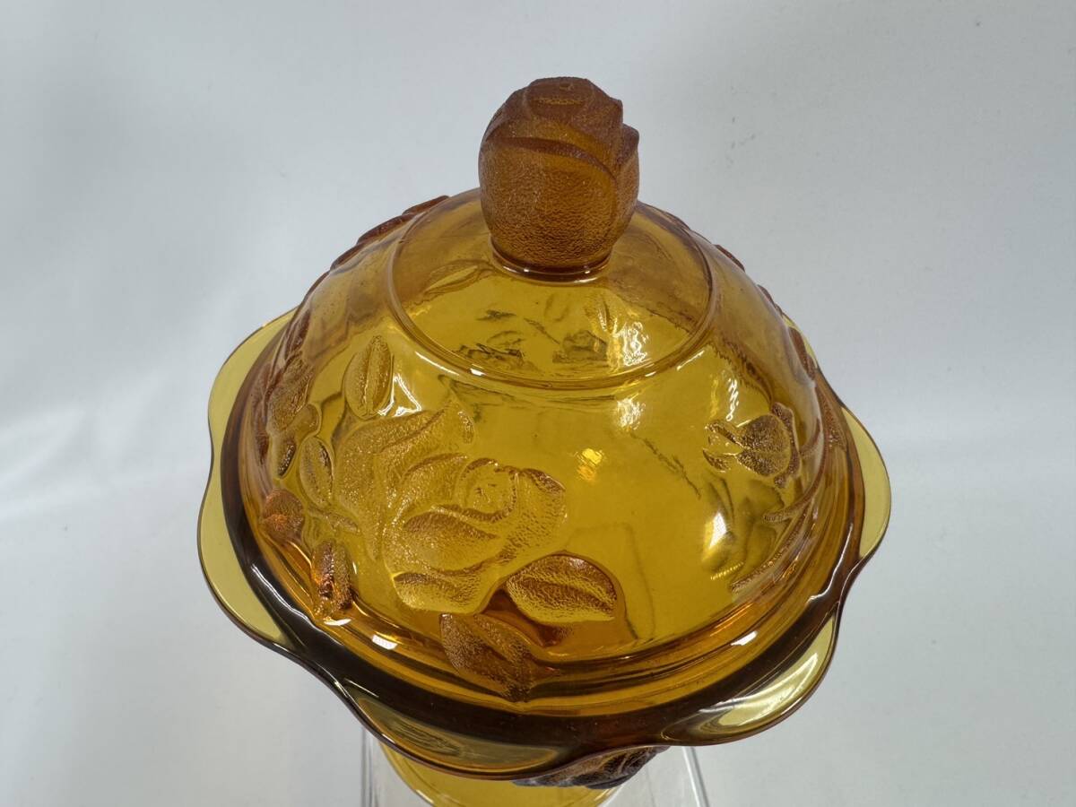 【超美品】 昭和レトロ 琥珀色 キャンディポット 工芸ガラス 花模様 小物入れ 蓋付 ヴィンテージ 琥珀 ガラス