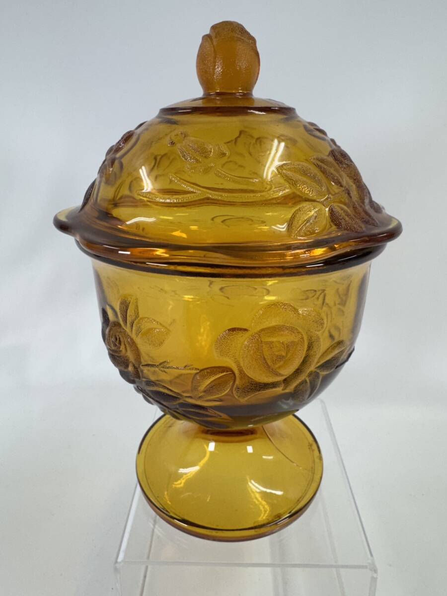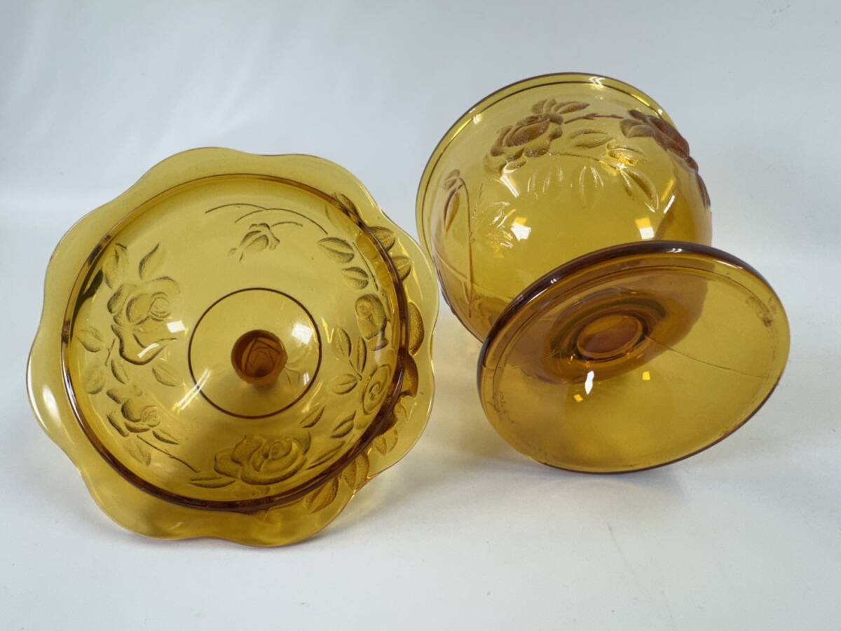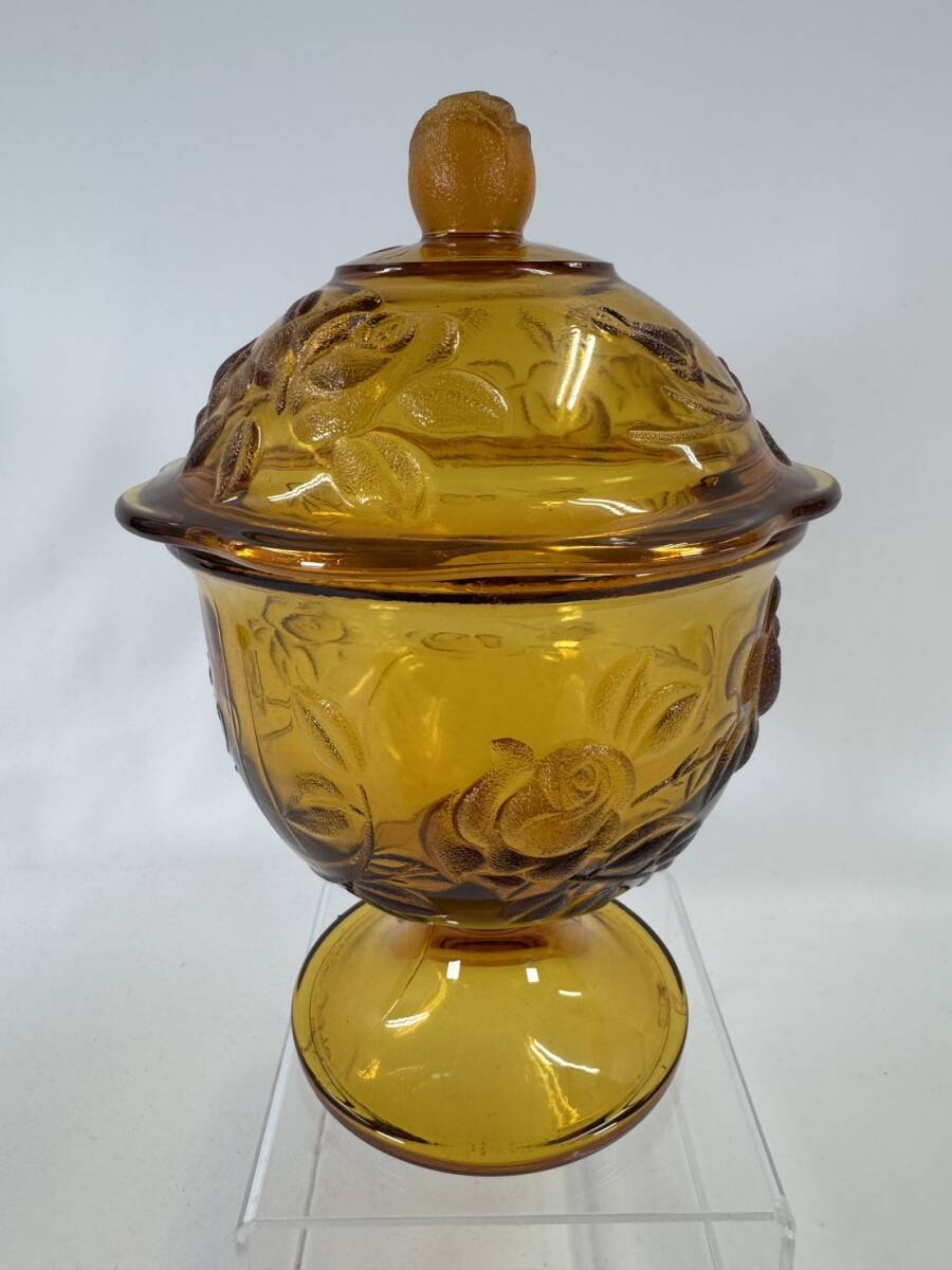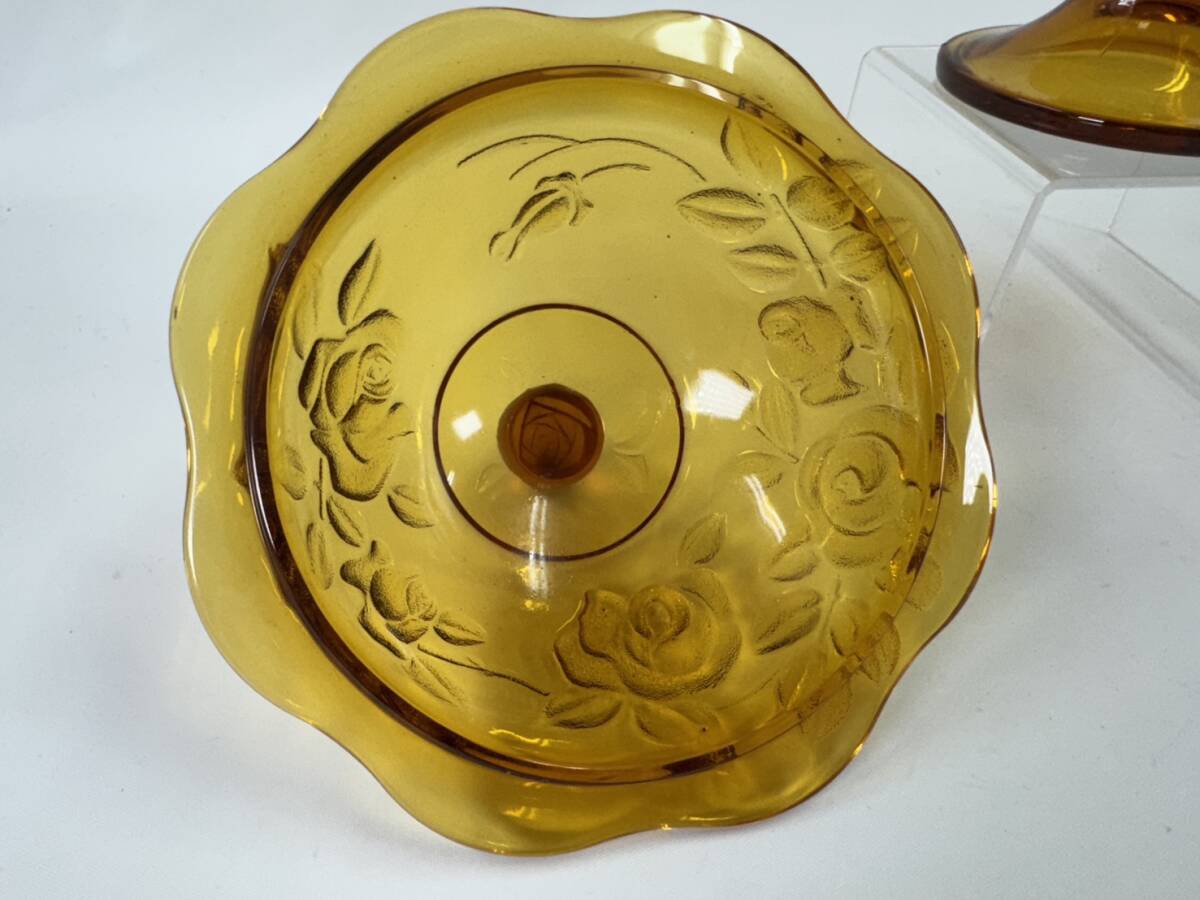 【超美品】 昭和レトロ 琥珀色 キャンディポット 工芸ガラス 花模様 小物入れ 蓋付 ヴィンテージ 琥珀 ガラス