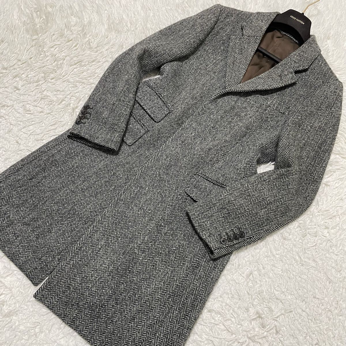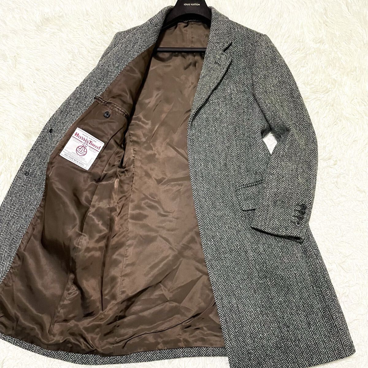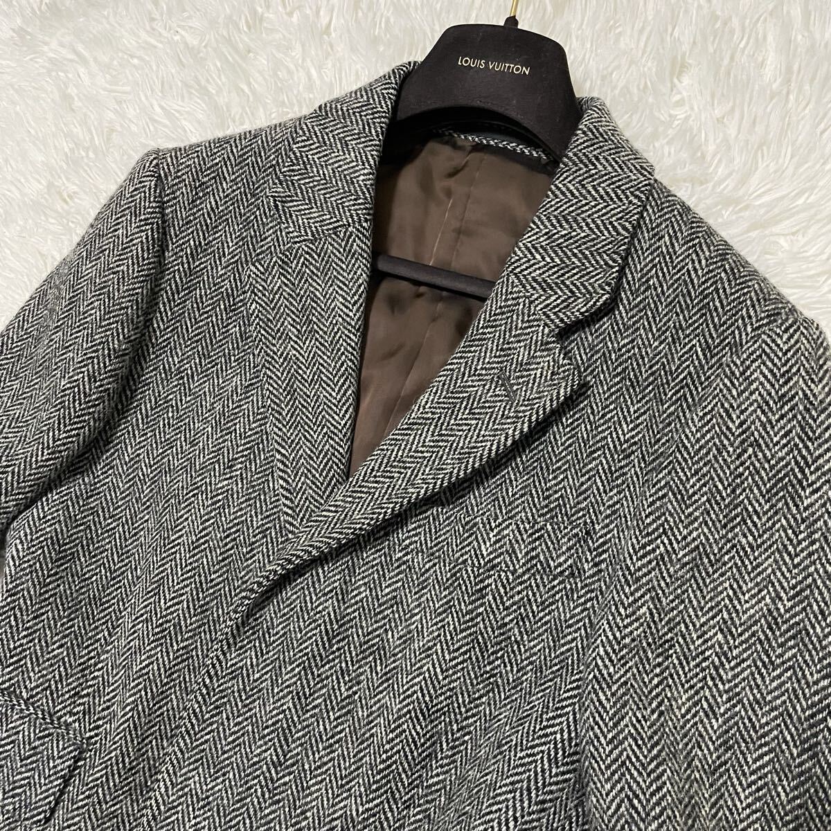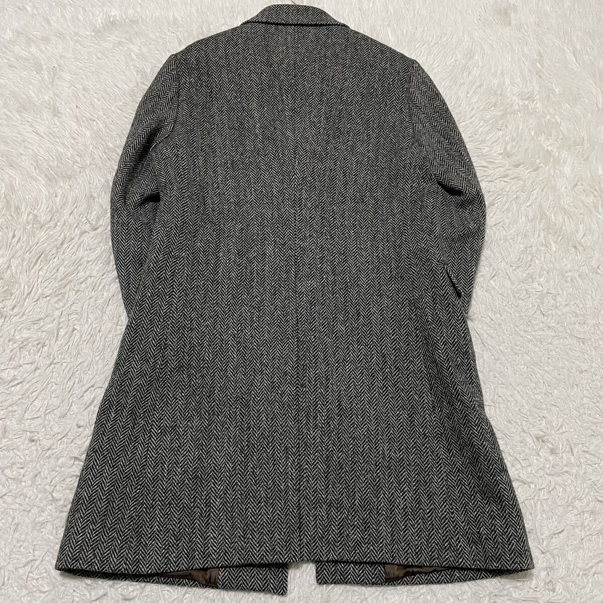 ハリスツイード【圧倒的王者の風格】チェスターコート ヘリンボーン柄 グレー系 ロングコート M-Lサイズ相当 比翼仕立て 肉厚ウール 美品