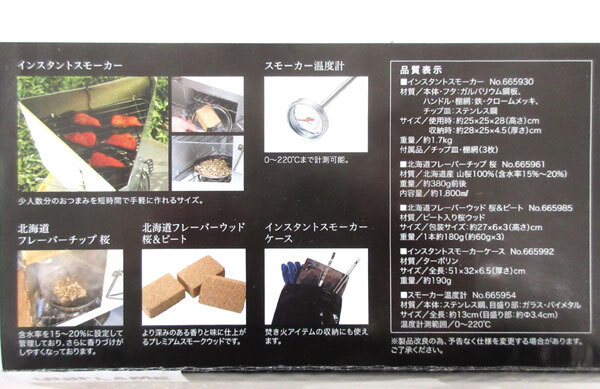 | 内 容 | ■ユニフレーム インスタントスモーカー エントリーセット (769874) ■日本製 ◆参考価格 8250円相当 インスタントスモーカー、インスタントスモーカーケース、 スモーカー温度計、北海道フレーバーチップ 桜、 北海道フレーバーウッド 桜&ピートが揃ったお得なセット! |