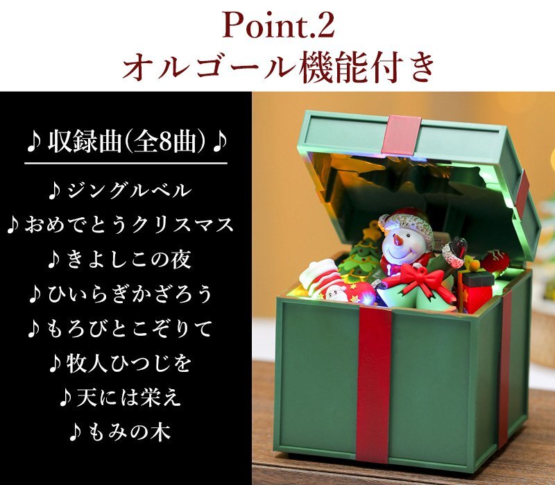 ![]() 動くクリスマスプレゼントボックス オブジェ 電源を入れると、楽しいクリスマスソングが流れ、プレゼントボックスが自動で開閉! 中からはかわいい雪だるまが顔を出したり隠れたりして、まるでサプライズプレゼントのような楽しい演出をしてくれます。 LEDライトがカラフルに光り、夜のインテリアにもぴったり。 玄関やリビングに飾るだけで、クリスマス気分をぐっと盛り上げてくれる動くオブジェです。 玄関やリビング、ツリーのそばに飾るだけで、お部屋が一気にクリスマスムードに包まれます。 大切な方への贈り物にもぴったりな、心ときめくインテリアライトです。 給電方法は2つ、付属のUSBコードで使用する他、 単三電池3本でコードレスとしての使用も可能! 精巧に作られている為、ライトを点灯させずに 単体でオブジェとして使用しても存在感抜群です! ギフトなどにもおすすめです! ●動作パターン● ・未点灯 ・LED点灯(音楽なし) ・LED点灯(音楽あり) ※乾電池、USB出力用のアダプターは付属しておりません。 点灯時の様子は動画でご覧くださいませ。 動画はこちら ↓↓↓↓↓↓↓↓↓↓↓↓↓ こちらをクリック! 【商品詳細】 カラー:グリーン&レッド サイズ(約): 横幅12.5cm×高さ20cm×奥行12.5cm コード長さ(約):98cm 重量(約):400g 素材:プラスチック 【給電方法】 単三電池×3/USBコード |