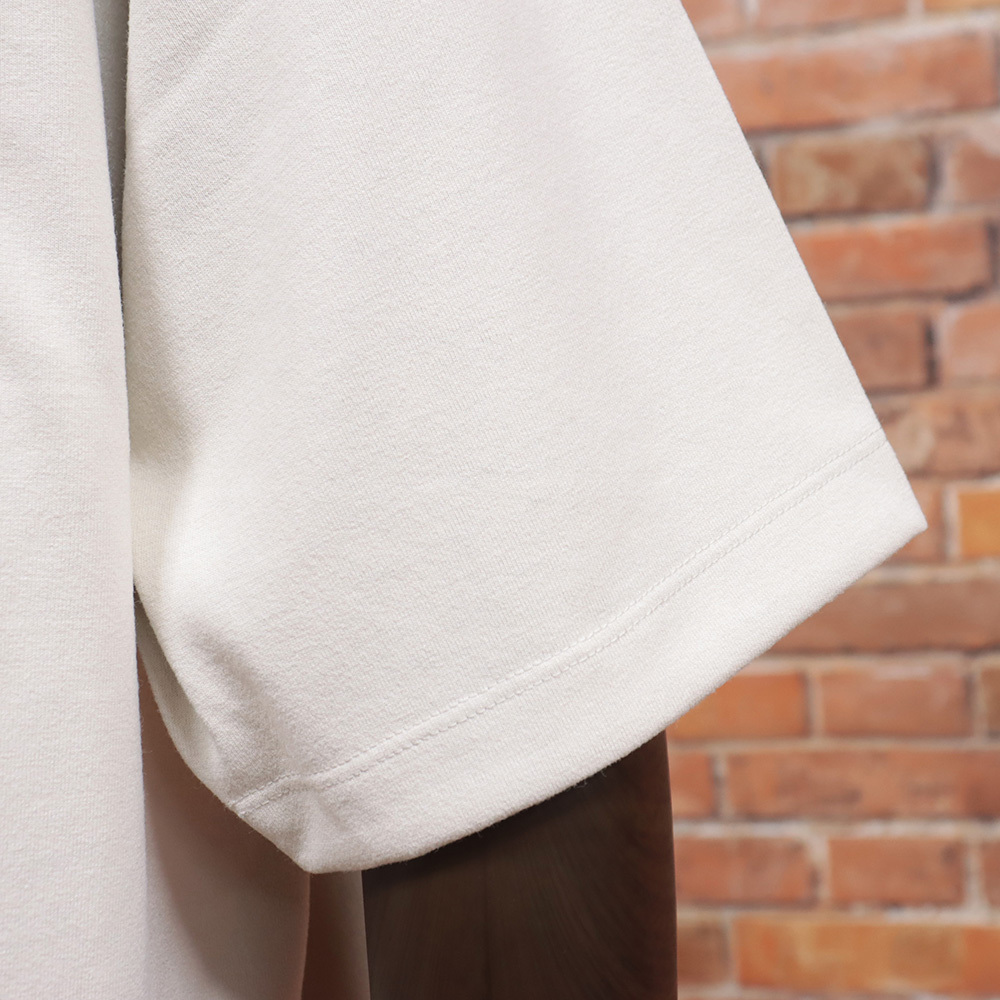 裾にリブをつけたデザインで、シルエットを変えて着こなせるTシャツ。たっぷり取られた身幅とラグラン仕様。袖は5分丈でゆったりとした印象を与えます。左胸にはメガネの収納ができるグラスポケットを搭載。左裾スリットの内側にはメガネ拭きがあしらわれており、メガネやスマートフォンの汚れをサッと手軽に拭き取れます。素材はポリエステル100%ながらコットンのような自然な風合いで、ドレープ感があり、体のラインを拾いにくい美しいシルエットを実現。シワになりにくく、型崩れや毛玉も防ぐイージーケア素材で、UVカット・吸水速乾機能も備えた高機能な一枚です。