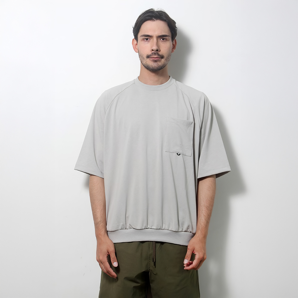 クルーネック、ラグランスリーブ(5分丈)、胸ポケット、裾リブ