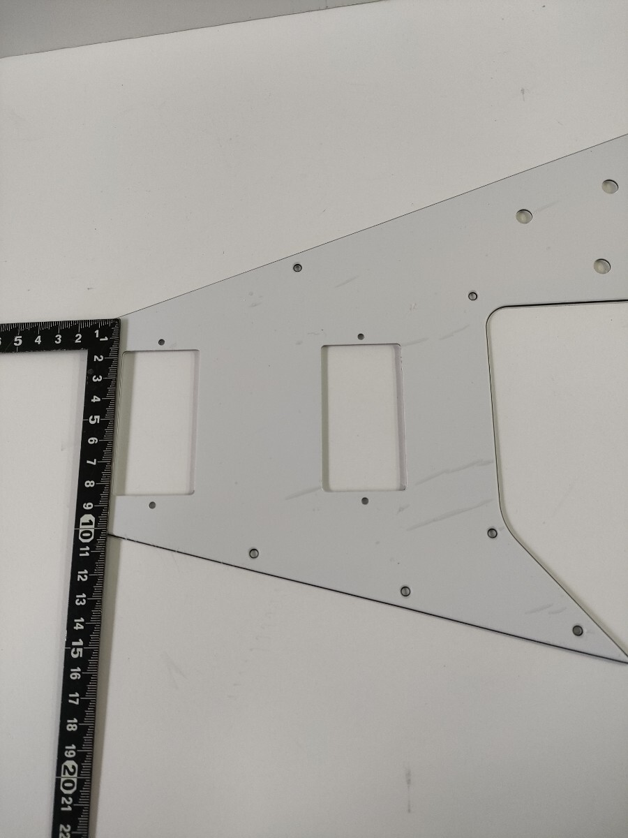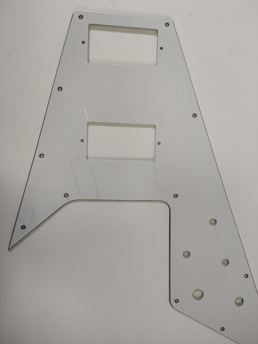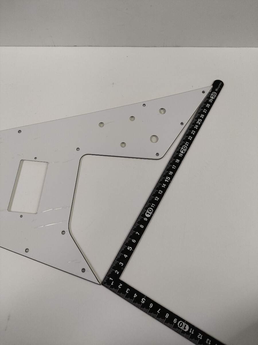 フライングV 用FLYING V ピックガード カラー:白 ギターのカスタムにどうでしょうか? サドル箇所は加工が穴加工が必要ですが好きな位置サドルが付けれるので便利です。 宜しくお願いします。