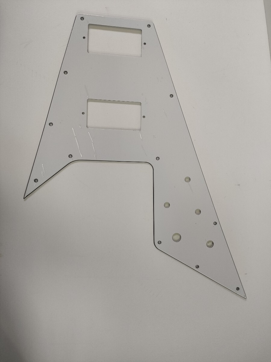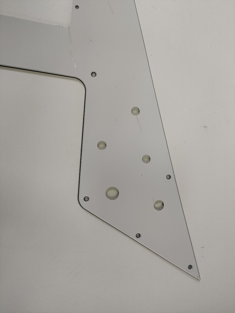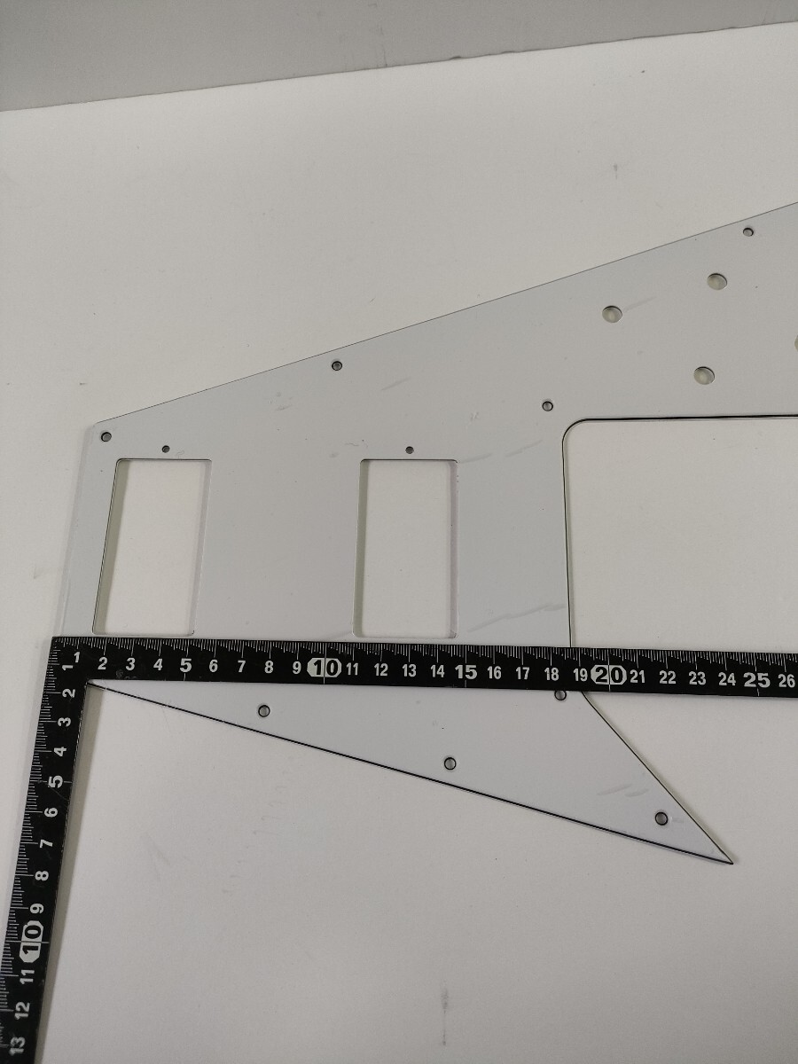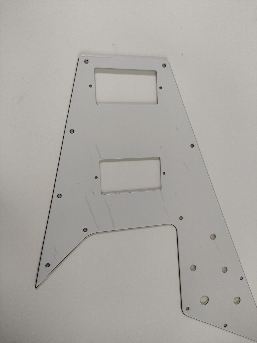 フライングV 用FLYING V ピックガード カラー:白 ギターのカスタムにどうでしょうか? サドル箇所は加工が穴加工が必要ですが好きな位置サドルが付けれるので便利です。 宜しくお願いします。