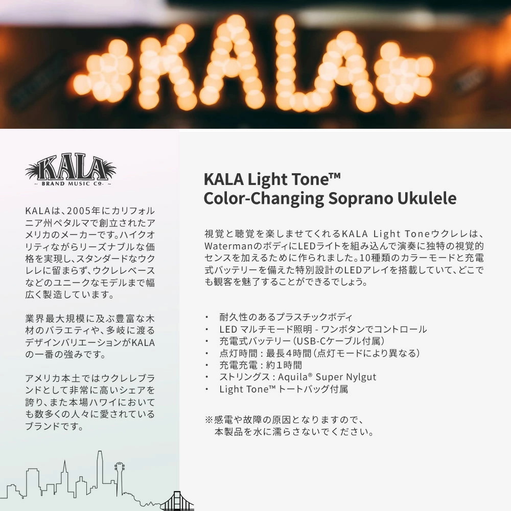 視覚と聴覚を楽しませてくれるKALALightToneウクレレは、WatermanのボディにLEDライトを組み込んで演奏に独特の視覚的センスを加えるために作られました。10種類のカラーモードと充電式バッテリーを備えた特別設計のLEDアレイを搭載していて、どこでも観客を魅了することができるでしょう。 ※感電や故障の原因となりますので、 本製品を水に濡らさないでください。