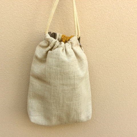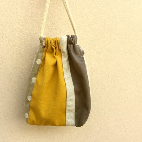 【入学、入園!】480円からし色とグレーのパッチワーク巾着袋 【手作り小物】