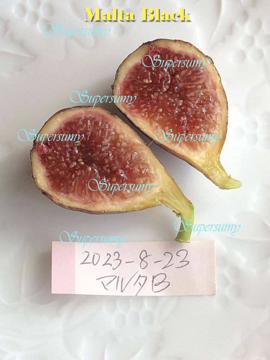 マルタブラック(Malta Black)は、果皮が黒に近い濃い紫色で、果肉は鮮やかな赤~深紅色をしています。果実は30gほどで少し小さめで、完熟するとベリーの風味が豊かで、いちごジャムのような感じで、イチジク愛好家の間でも人気の品種です。Ourfigs.comのフォーラムによると、Malta Blackは非常に丈夫で健康的で、早期熟成で、すべての栽培者にとって優れたイチジクです。この品種はBelleclareから発祥したもので、品種番号35です。Belleclareによると、Malta BlackはCelesteの祖父母であるが、果実の落下の問題を抱えていないようです。エトナ系統の中ではシカゴハーディーと類似しているが、豊産性と収穫安定性で優れているという評価がされているようですが、実際にシカゴハーディーを育てていないので分かりません。Ourfigs.comのファーラムを参照してください。