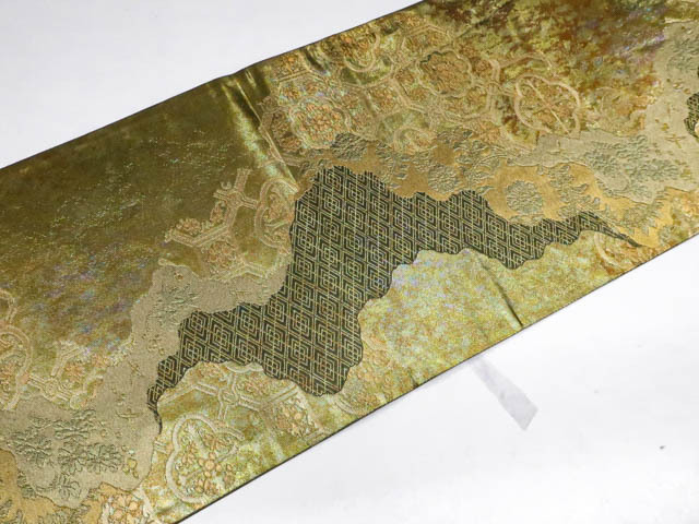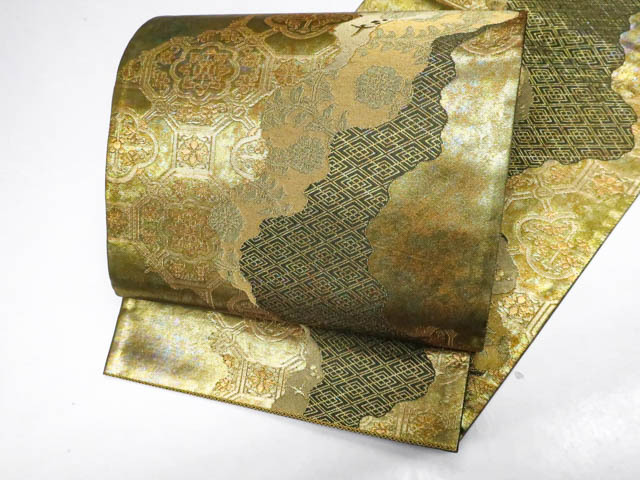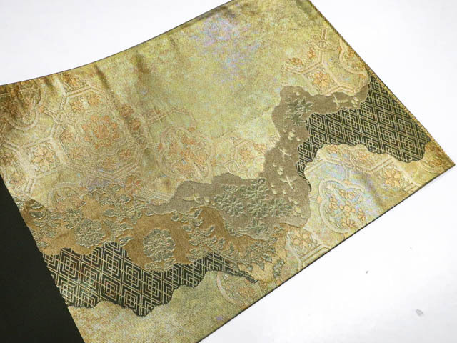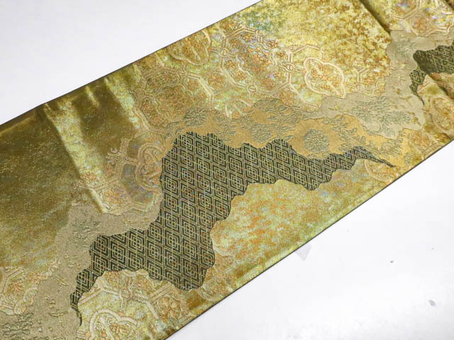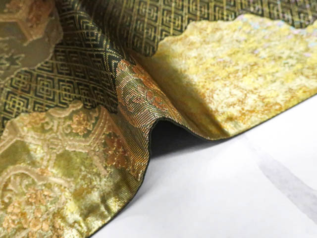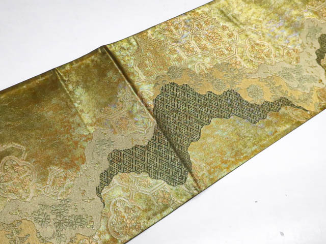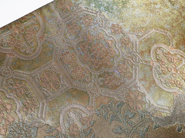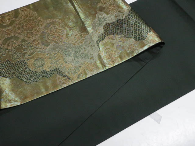 リサイクル商品の為、無地場薄汚れがございますがご着用いただけると存じます。 地色は金・緑です。 1枚目の画像が近いお色かと思われます。 素材は正絹です。 |