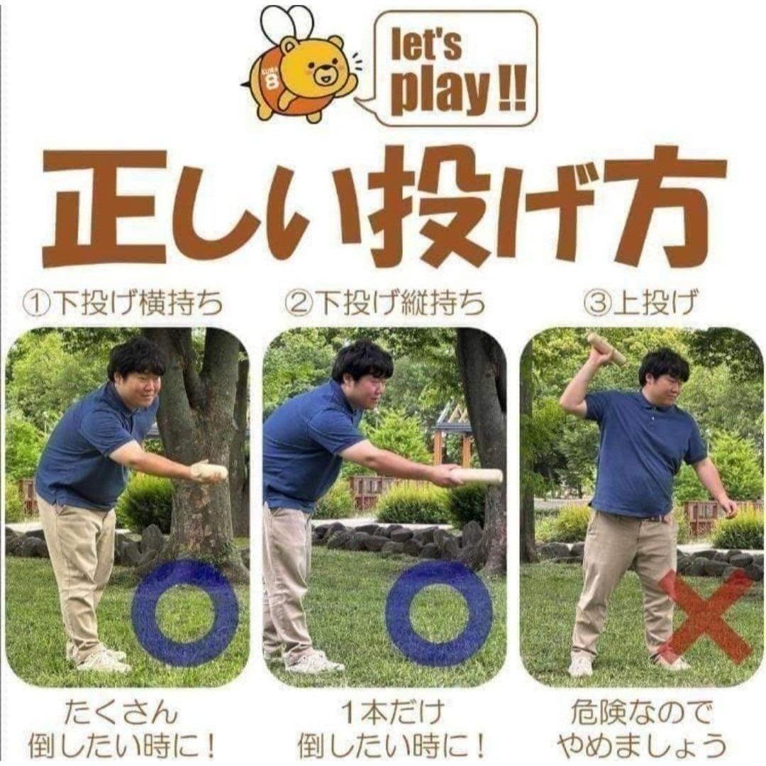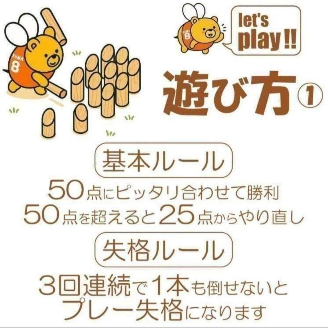 〇【基本の楽しみ方】投棒を投げ、スキットルを倒します。 スキットルを倒し、そのスキットルに印字された数字が獲得できたり、複数のスキットルを倒したり、スキットルの数と同等のポイントを獲得します。 めざせ50点!