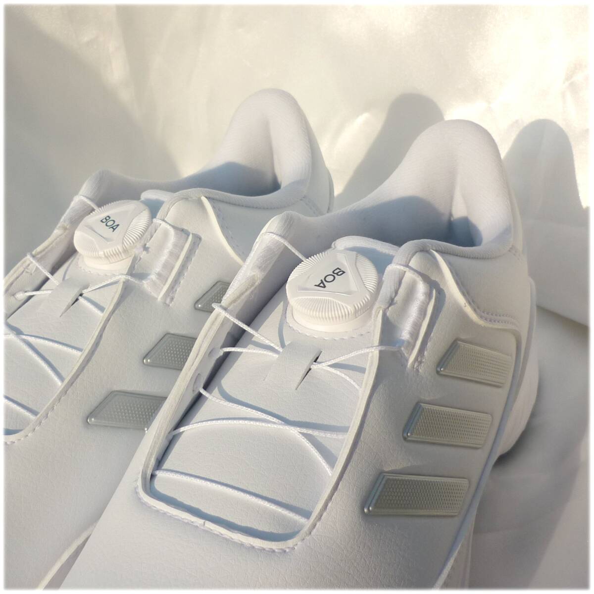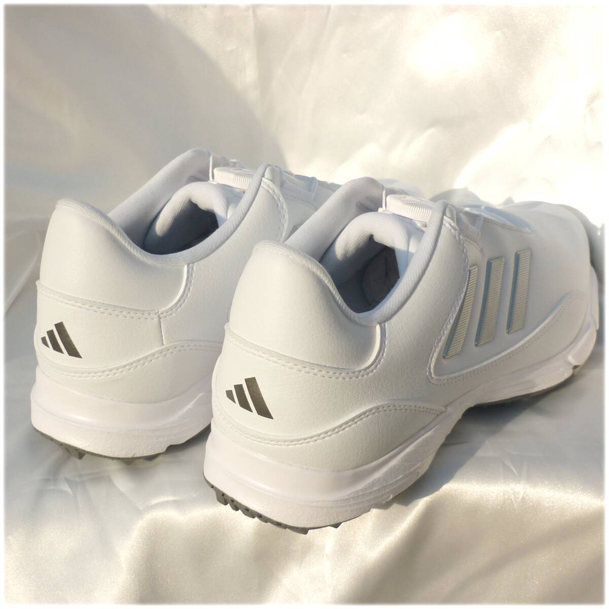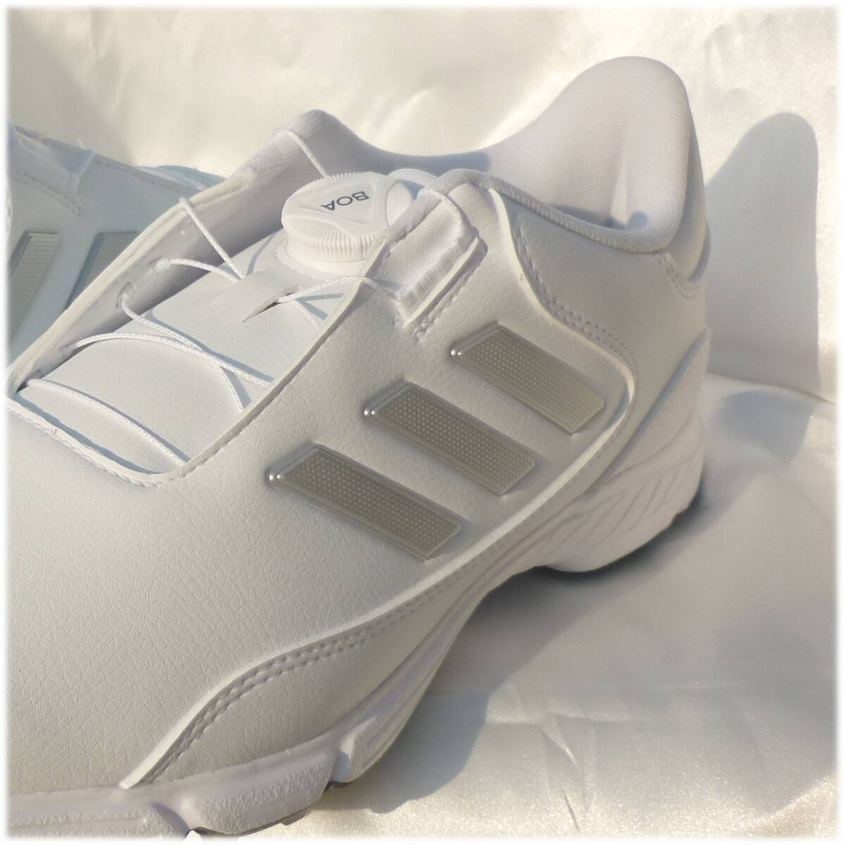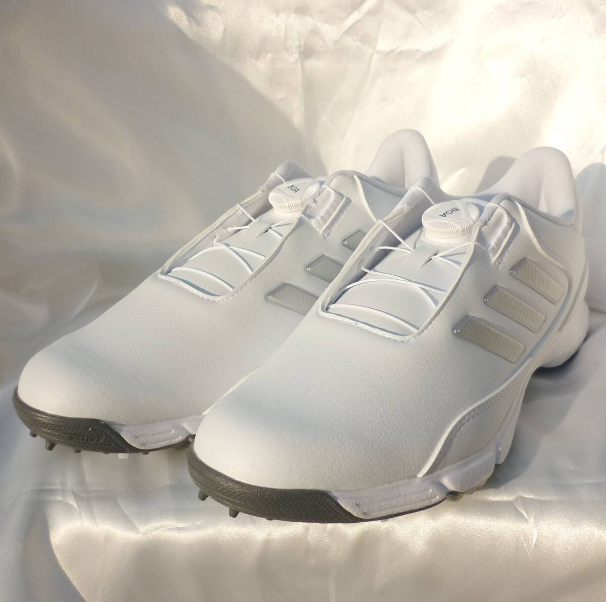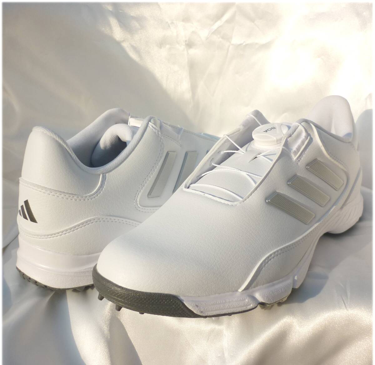 新品未使用品ですアディダスゴルフのゴルフシューズ。GOLF LITE MAX BOA 24白地にシルバーのライン入りで上品でシンプルなデザインマイクロ調整可能なダイヤルベースBOAフィットシステムワイドフィット耐水性軟質合成アッパー軽量感交換可能なスパイクトラキオンアウトソールアディダス正規品(直営店で購入) 品番IF3044 定価17990円 553