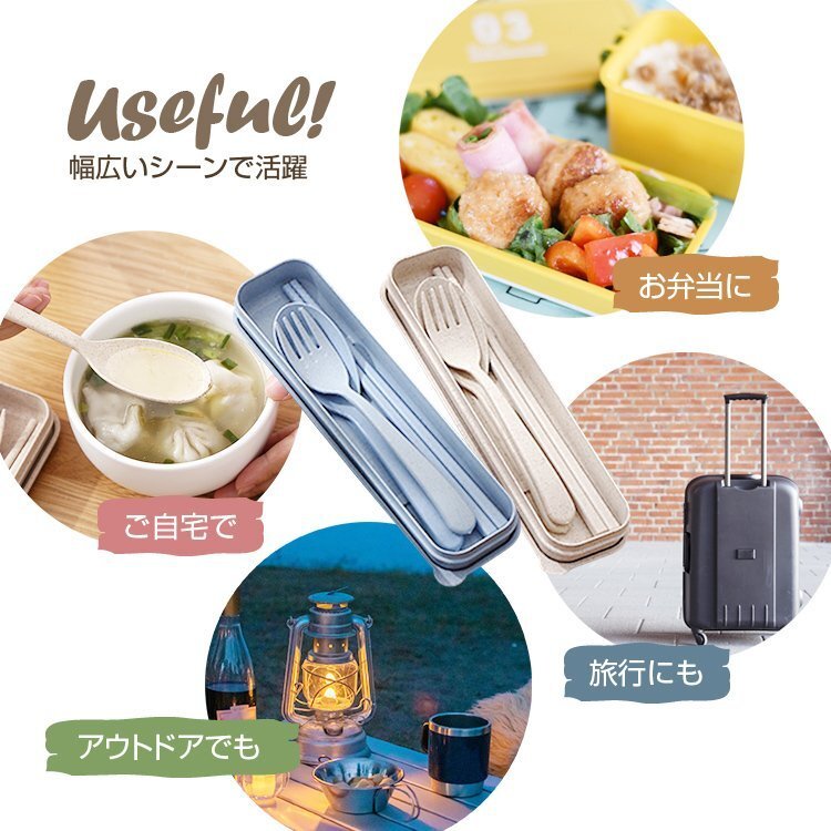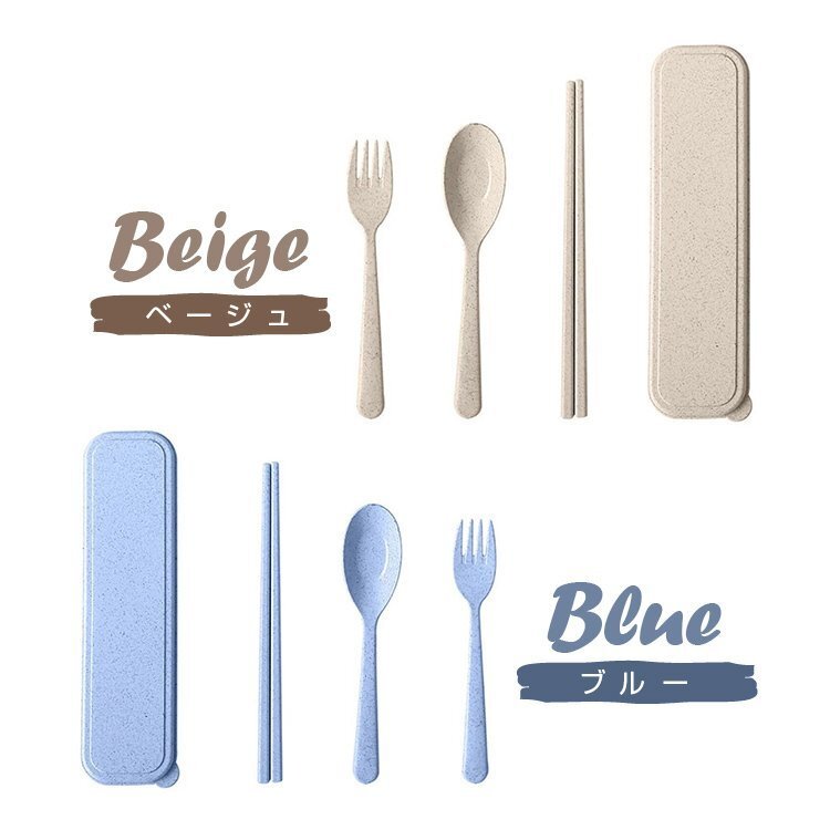 ◆北欧デザイン 麦わらカトラリーセット 箸/スプーン/フォーク/ケース ベージュ ブルー ご自宅 お弁当 アウトドア キャンプや登山 ピクニックなど 旅行 新生活【ブルー】RYB4IN1