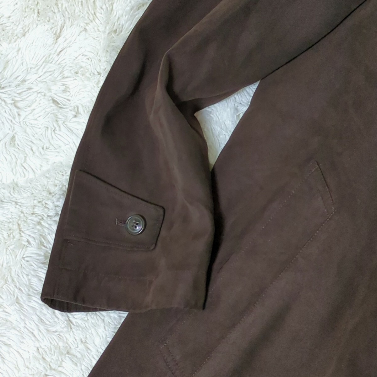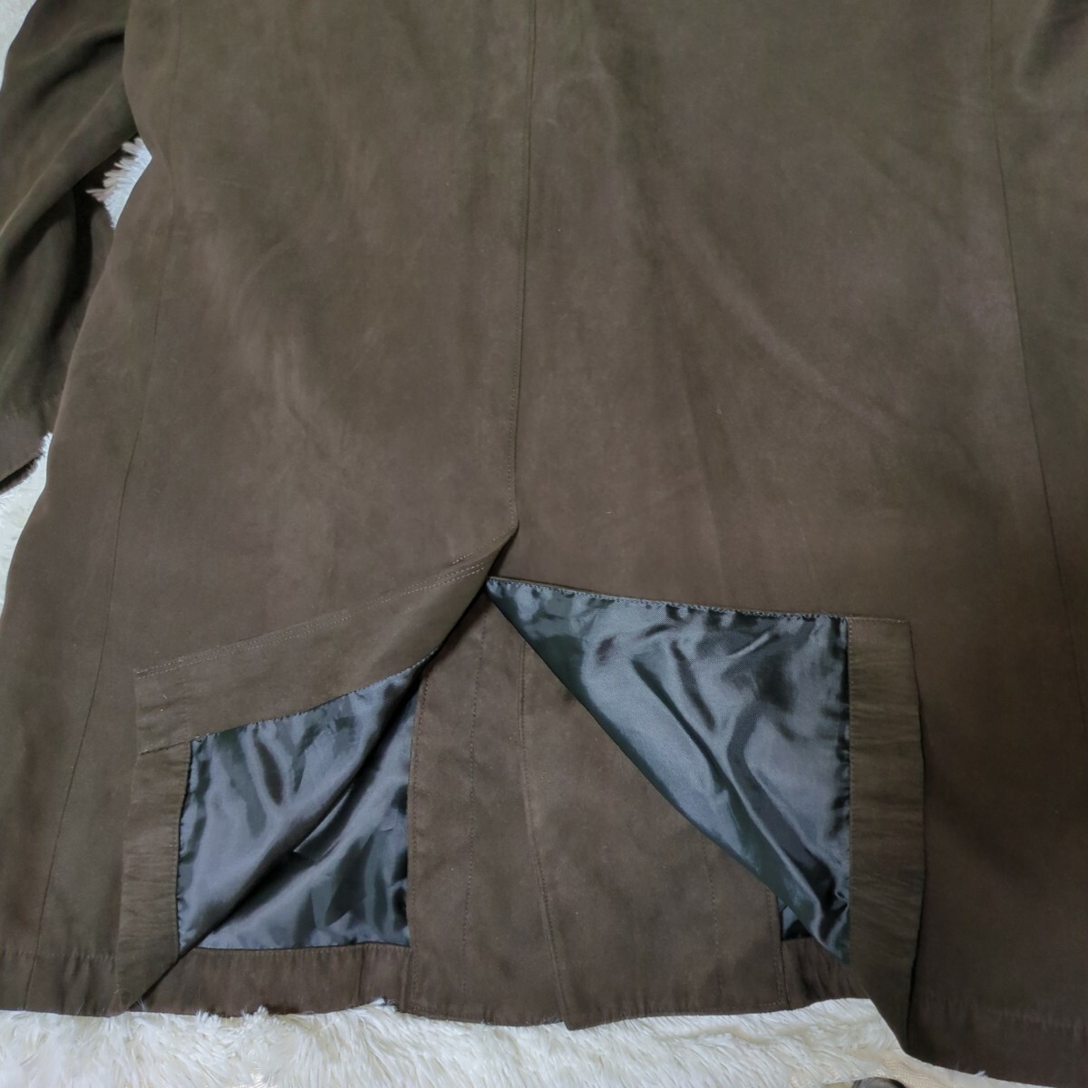 ポリエステル系素材(フェイクスウェードレザー)で、色はブラウン系です。