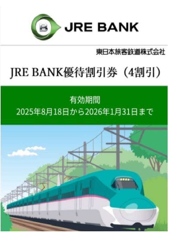 JR東日本 JRE BANK優待割引券(4割引) 2枚分 2026年1月31日まで