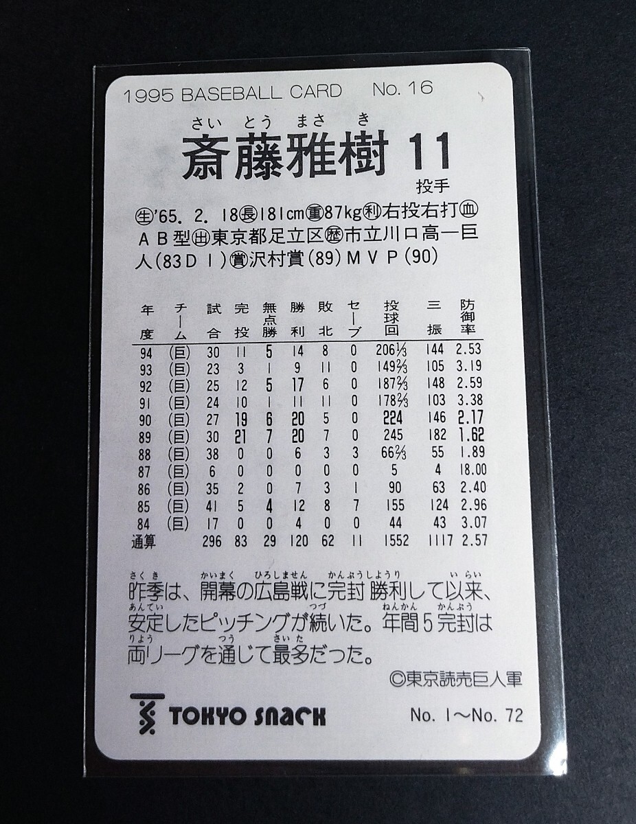 1995年カルビー 斎藤雅樹(巨人)No,16。