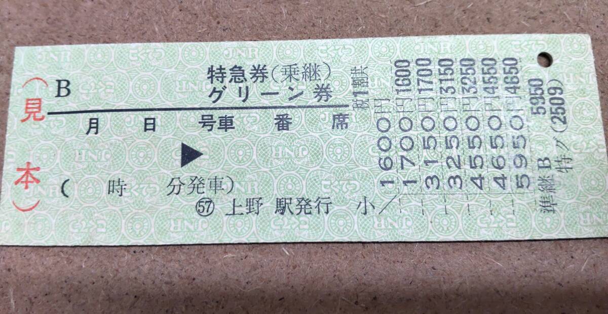 SS1558   金額切断式 特急券・グリーン券 昭58見本券【 B(乗継)1600円~ 】上野駅発行