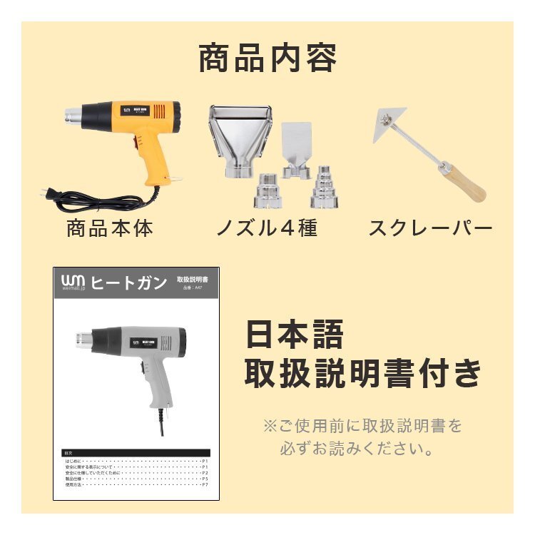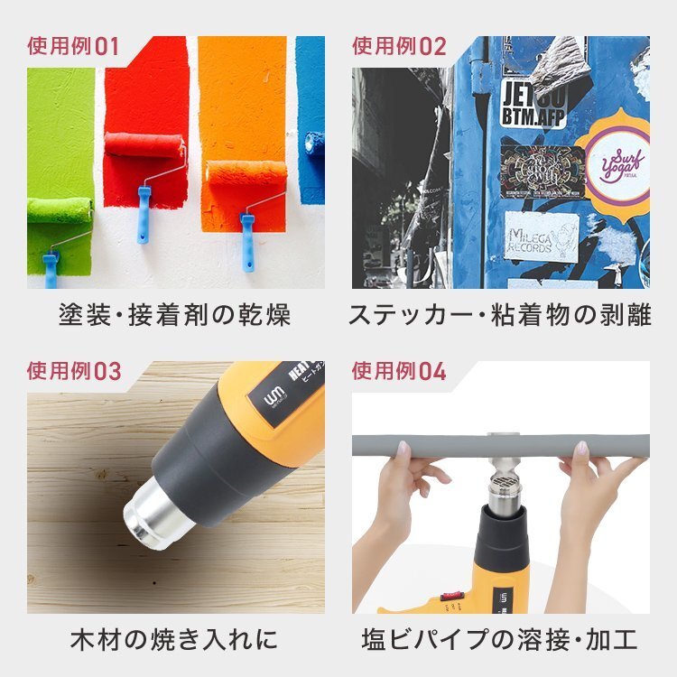 \省エネ設計で消費電力を約30%削減!/ エコで環境に優しいだけでなく、電気代も抑えられます♪ 最新モデルの2段階強弱調節機能付きホットガンです! DIY初心者や女性でも簡単に扱える優れモノ!! 日曜大工やお仕事など、様々な熱処理作業に使えます。 他にもたくさんの使い方! ・塗装の乾燥に! ・ステッカーの剥離に! ・焼き目を入れる! ・塩ビパイプの溶接・加工に! ・ゴルフクラブシャフトの交換に! ・シュリンクフィルムの熱融合など! 【詳細】 カラー ブラック サイズ(約):奥行25.5×高さ19×横幅7cm コード長さ(約):約140cm 電源:110V 50/60Hz(一般の家庭用電源でも使用可能) 電力:1300W 機能:2段階スイッチ切り替え 商品コード:A47BK ※使用中及び使用後も先端ノズルが大変熱くなりますので十分に注意して下さい。 ※ドライヤーの様には使用できません。髪や衣類の乾燥には絶対に使わないで下さい。 ※輸入品の為、小傷、汚れが付いている場合がございます。 ご了承のうえ、ご落札下さい。 ※写真と実物は多少異なる場合がございます。あらかじめご了承下さい。 |