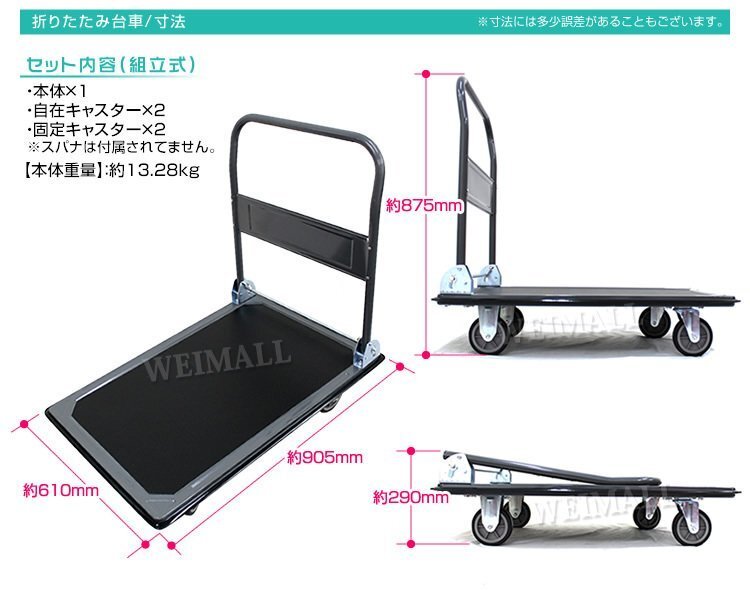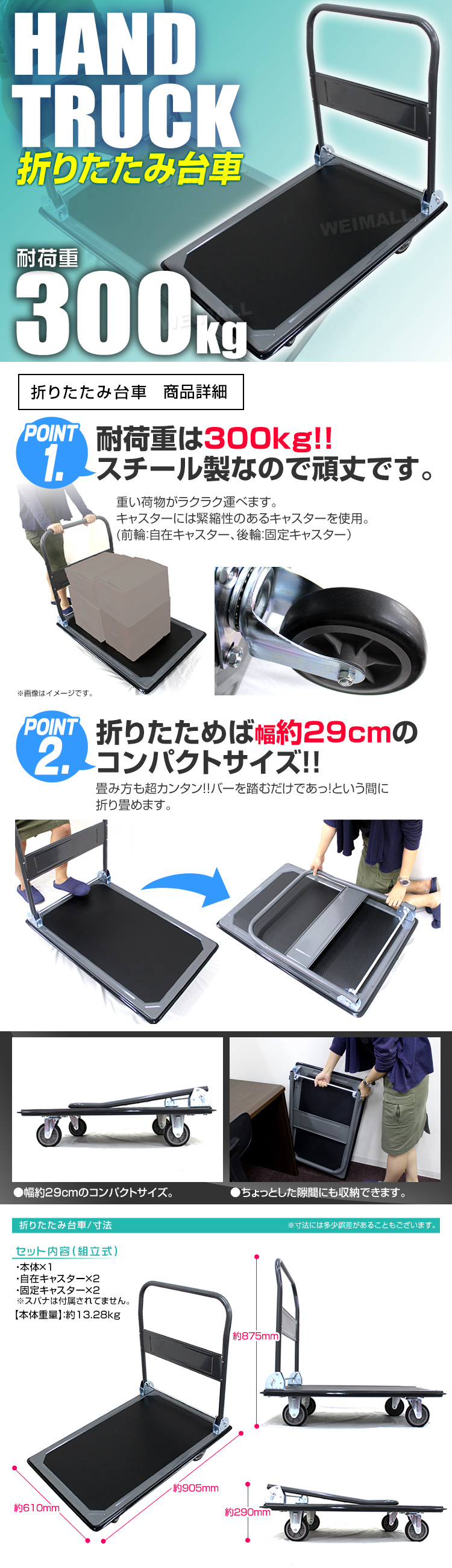 | 業務用としてはもちろん、家庭に一台あれば、重い荷物の運搬時に活躍します! 耐荷重が300kgまで対応しておりますので、重たいものもカンタンに運べます。 アウトドアやレジャーに台車を持っていくと便利です! 野外では食材や食器、BBQ道具の運搬に活躍すること間違いなしです! また倉庫内作業、ゴミ出しも台車があればスムーズに行えます♪ 折り畳んだときの厚みはなんと約29cm! 邪魔になりにくく、玄関や車などの限られたスペースにスッキリ収まるコンパクトな台車です! 【商品仕様】 耐荷重(約):300kg サイズ(約):幅610×奥行905×高さ875mm 折りたたみ時サイズ(約):幅610×奥行905×高さ290mm 重量(約):13.3kg 材質:スチール 【注意事項】 ・こちらの商品は組立商品となります。(車輪をつけるだけです。設置作業はどなたでも簡単に組み立てできます) ・箱がつぶれている場合もございますが商品に問題はありません。 ・海外製品で、簡易梱包での輸入のため風防に擦れや多少の小キズなどがある場合がございますが、商品自体には問題ありませんのでご了承下さい。 ・仕様・デザインは改良のため予告なく変更することがあります。 |