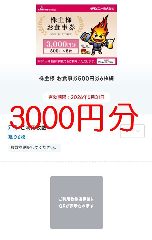 | 【即決2026/5/31まで】500円×6枚 3000円分 チムニー 株主優待お食事券 電子チケット はなの舞 さかなや道場 | |