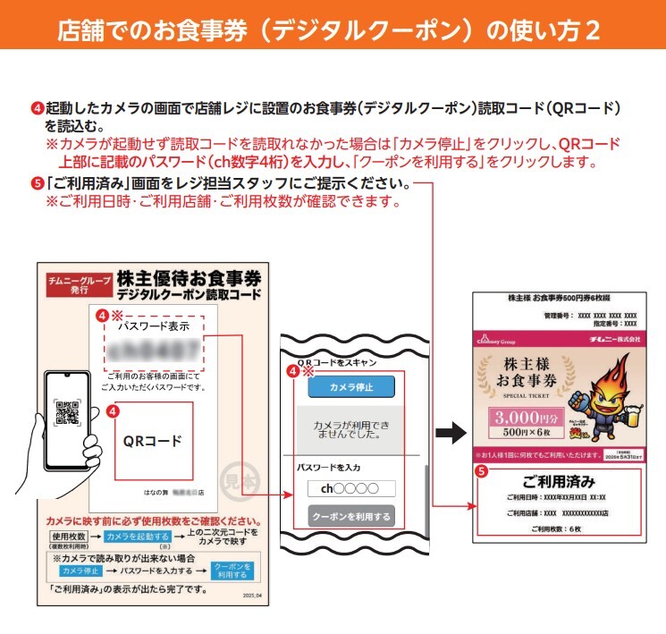 | 商品説明 | チムニーの株主優待電子チケットです。 全国のはなの舞、さかなや道場などグループ店舗で飲食の際にご利用いただけます。 使用方法等に関しての詳細は写真2~3枚目及びチムニーホームページを参照ください。 有効期限は2026/5/31までです。 数量1で3000円分の価格です。 ご入金確認後に、取引ナビにて優待URLをお伝えします。 |