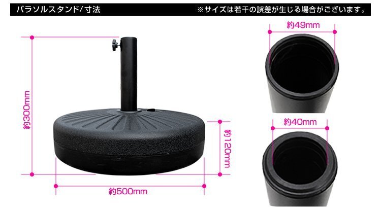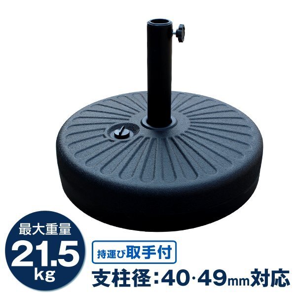 | パラソルベース 注水式 中に水を入れて使用するパラソルベーススタンド。 ガーデンやベランダでのパラソルの使用でオススメ! 使用後は中の水を抜けば軽くなるので持ち運びにも便利です。 本体は取っ手付きなので持ち運びがラクラク! ポール受けキャップは本体に収納できます。 パラソルスタンド以外にも、のぼり等のスタンドに最適! |