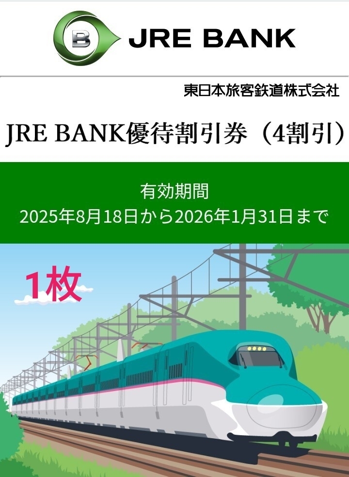 JR東日本路線で使えるJRE BANK優待割引券 (4割引) × 1枚の出品です。