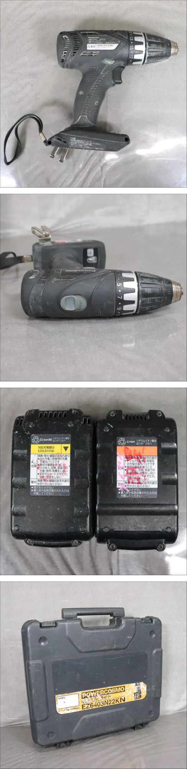 | 商品説明 | ★最後までお読みいただき、ご理解の上でのご入札をよろしくお願いいたします。 【FU003】 【動作OK】 Panasonic EZ7441 パナソニック 充電ドリルドライバー バッテリ2個 【動作状況】 こちらは、Aになります。 A:動作確認OK(全ての機能が問題なく使用できるか保証できません) B:通電のみ確認(動作確認は行っていない為ジャンク品の可能性含む) C:動作未確認品(ジャンク品の可能性含む) D:不動品、ジャンク品 ※動作未確認の商品は保証出来ません。 【商品状態】 基本的に中古品の為、スレや傷・汚れなどございます。 多数商品がある場合、傷や汚れを写真に載せきれない可能性もございます。 あらかじめご理解・ご了承の上入札をお願いいたします。 また、細かくクリーニングしている訳ではありませんので 状態を極度に気にされる方、神経質な方は入札をお控えください。 ■写真に写るもののみの販売となります。 写真にないものは付属いたしません。 画像をご確認の上、商品の状態に納得して頂いた方のみ入札をお願いいたします。 【取引ナビの対応日時】 ■平日9:00-17:00となります。※土日祝日は休業 【発送方法】 発送は佐川急便よりお送りいたします。 原則ご入金後、発送まで3日~7日お時間を頂いております。落札商品の量によって発送までのお時間が前後してしまう可能性があります。商品をお急ぎの方はご注意ください。 ※発送元地域が異なる商品の同梱はできません。 また土日祝日はヤフオクの取引全般をお休みしておりますので発送/連絡はできません。いつ頃発送するのか等の催促はおやめください。 ※沖縄・離島の方は【中継料】が発生し送料が高額になります為、佐川着払いとなります。 ※中継料が発生した場合、追加で中継料分の不足送料を請求させて頂きます。必ずご自身のお住まいをご確認頂いてから入金をお願い致します。 【直接引き取り】 引き取り場所は東京都八王子市になります。 詳しいご案内場所は落札後、取引ナビにてご連絡いたします。 受付時間:平日10-17時 (12-13時を除く) 商品の保管期間は支払い後、1週間(7日間)とさせていただきます。 直接引き取りをご希望される場合は、以下の通りお手続きをお願いいたします。 お取引の際は、「単品取引」を選択してください。 送料の選択では、必ず「0円(無料)」をご指定ください。 【重要】 システムの都合上、複数ご購入の場合でも「まとめて取引」は選択されないようお願い申し上げます。 ご理解とご協力のほど、よろしくお願いいたします。 ■手順 ① 取引情報の入力 ② yahoo!かんたん決済で支払うをクリック ③ 配送方法を直接引き取り0円を選択し決済を行ってください。 ④ 取引メッセージに 直接引き取り希望と、希望日、希望時間帯をお知らせください。 後程、ご案内の通知をいたします。 【注意事項】 ■発送連絡と同時に評価も入れております。評価不要の方はご落札時にメッセージでお知らせください。 ■商品到着後、破損があった場合は配送業者へ一度ご連絡をお願い致します。 ■発送方法の変更はお受けできません、また送料に納得がいかないままの入札はご遠慮ください。 ■商品到着後7日以上経ってからの返品・返金は対応出来ません。品物が到着次第すぐに商品の状態をご確認ください。 ★他にも沢山の商品を出品しております。 ご興味のある方は、他の商品も是非ご覧下さい。