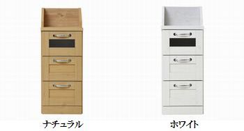 カウンター下のスペースを活用する、カウンター下収納。 カントリーな雰囲気を醸し出す、木目調のデザインが美しいチェストです。 引き出しが3杯ついているので、 取り出しやすいところに置いておきたい日用品を収納するのにとても便利です。 |