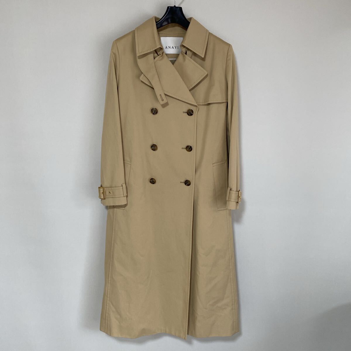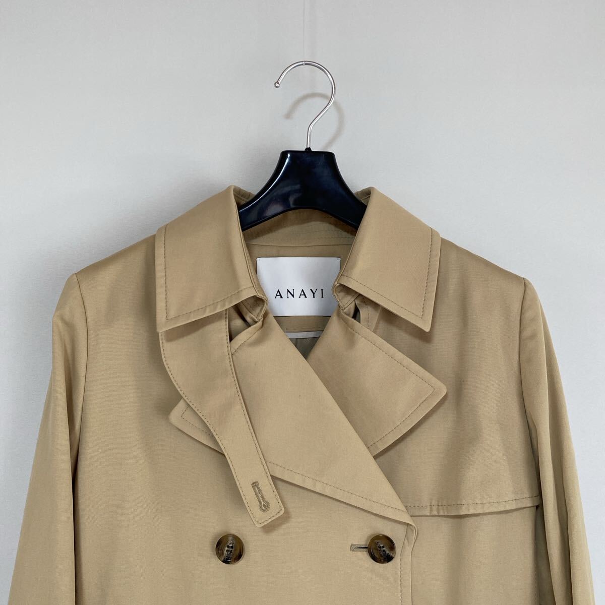 ANAYI(アナイ)のお品です。程良く、ハリ感のあるトレンチコート。肌寒い時期から春先、秋口まで、気温に合わせて着用できます。撥水性や防シワ性に優れた素材が使用されており、機能性と見た目の両方を重視している事もポイントです。お色は画像でご確認ください。ベージュ系です。(^^♪ 画像に実際のお色が良く出ています。ベーシックなブラックやネイビーとは異なり、程よいカジュアル感とこなれ感を演出できるのが魅力です。フロントはボタンが4つでとめます。ポケット、外両サイド×2。内ポケット×0。スリットなし(背面はヒダになっています)。付属品:ベルト