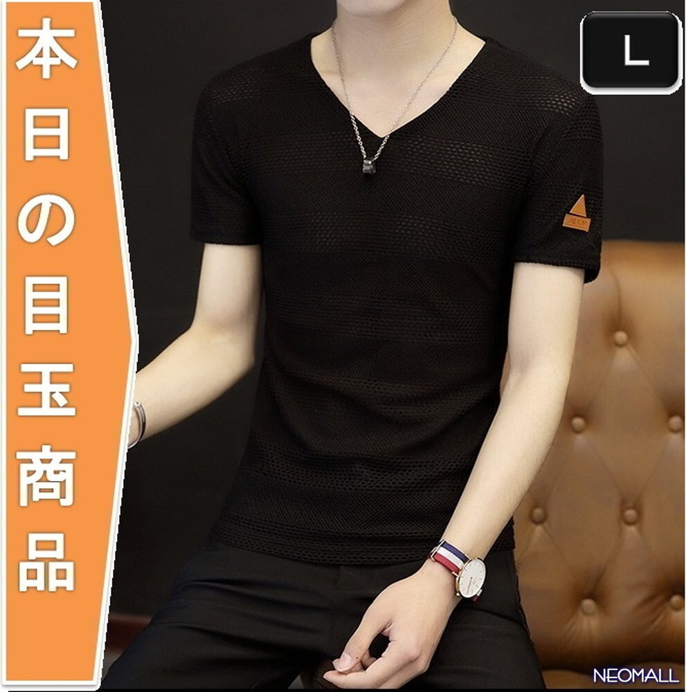 今日の目玉 ☆ Vネック 半袖 Tシャツ【298】ブラック Lサイズ トップス お洒落 シンプル 春夏