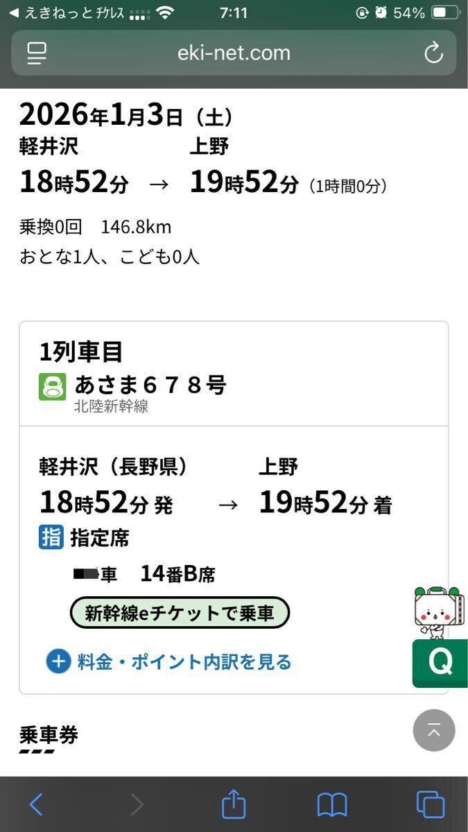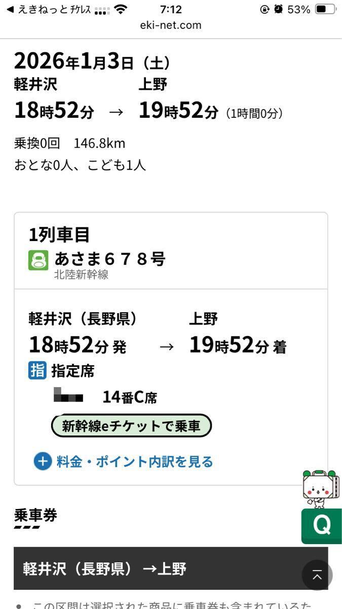 2026/01/03 軽井沢駅18:52発→上野駅19:52着の新幹線あさま号、大人1名小人1名の計2名、B席とC席の横並び席です。