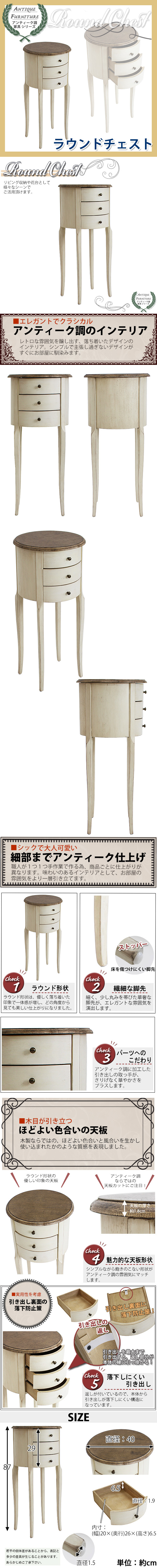 | 商品名 | アンティーク調 ラウンドチェスト W約40×D約40×H約87cm ホワイト 花台 ラウンド 3段 三段 引出し 引き出し アンティーク家具 木製 チェスト アンティーク風 アンティーク インテリア 家具 リビング収納 シャビーシック シャビー 白 antiqueh37wh |
