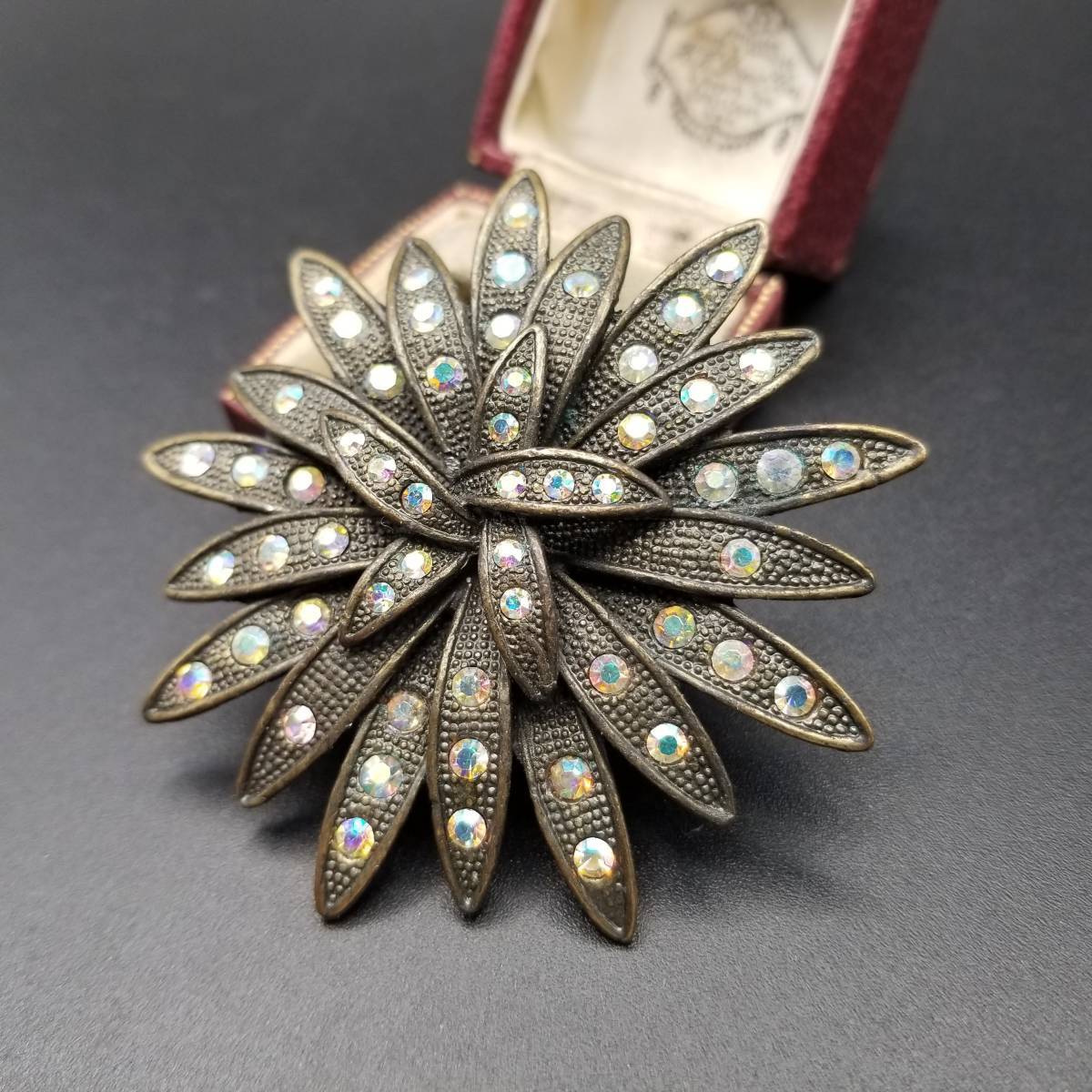 大きなお花 植物モチーフ ヴィンテージ フラワー ブローチ ブロンズトーン ラインストーン 煌めき フローラル 大ぶり 存在感 6Y-E