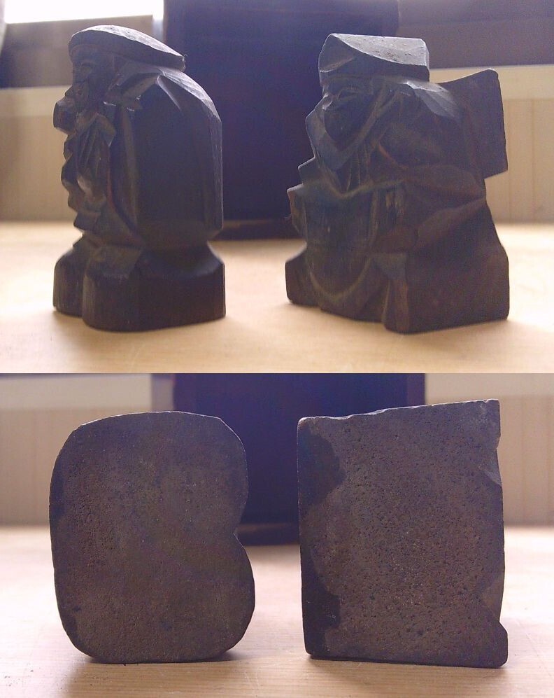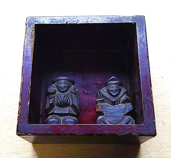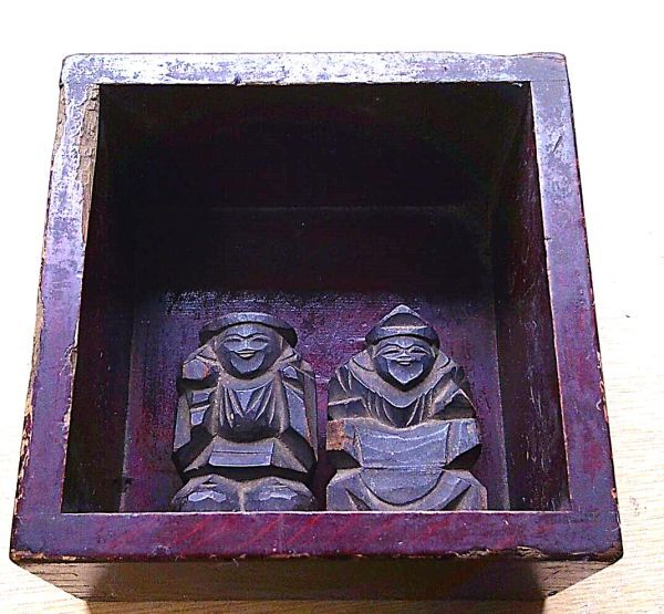 ◆B-467 恵比寿・大黒 像 木彫り 厨子(マス)入り 縁起物 時代物 枡)高さ8cm 幅14.3cm角
