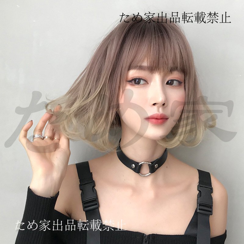新品人毛 内巻きショートボブウィッグ ローズピンク×ゴールドの柔らかなグラデーションカラー つむじ部分手植え 自然に見えますフルウィッ