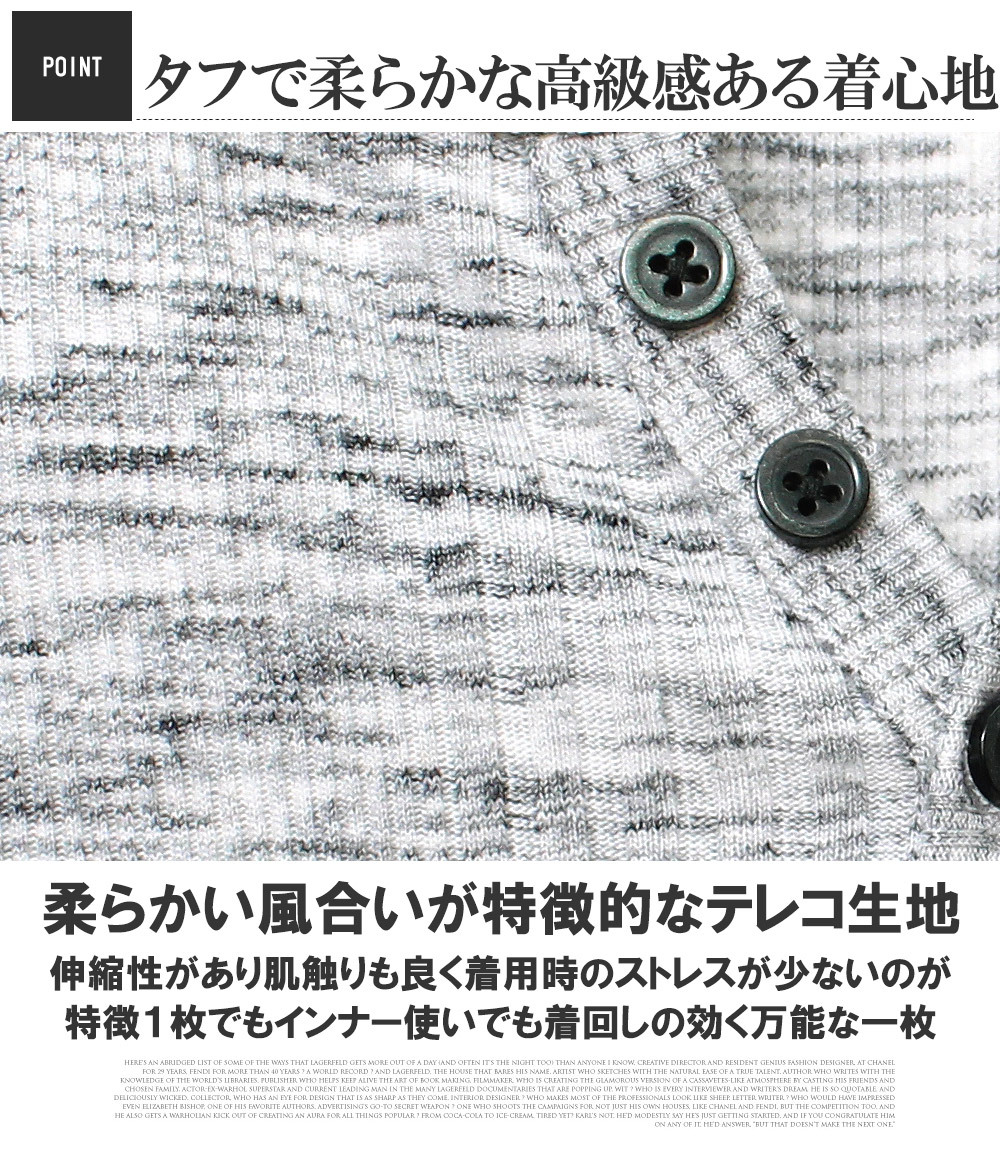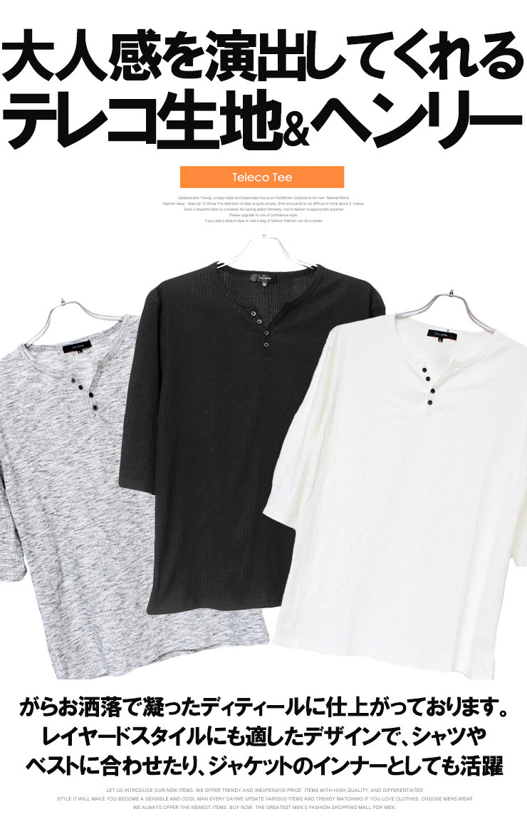 | 商品説明 | 柔らかい風合いが特徴的なテレコ生地を使用したヘンリーネック七分袖Tシャツ。 |