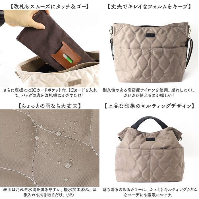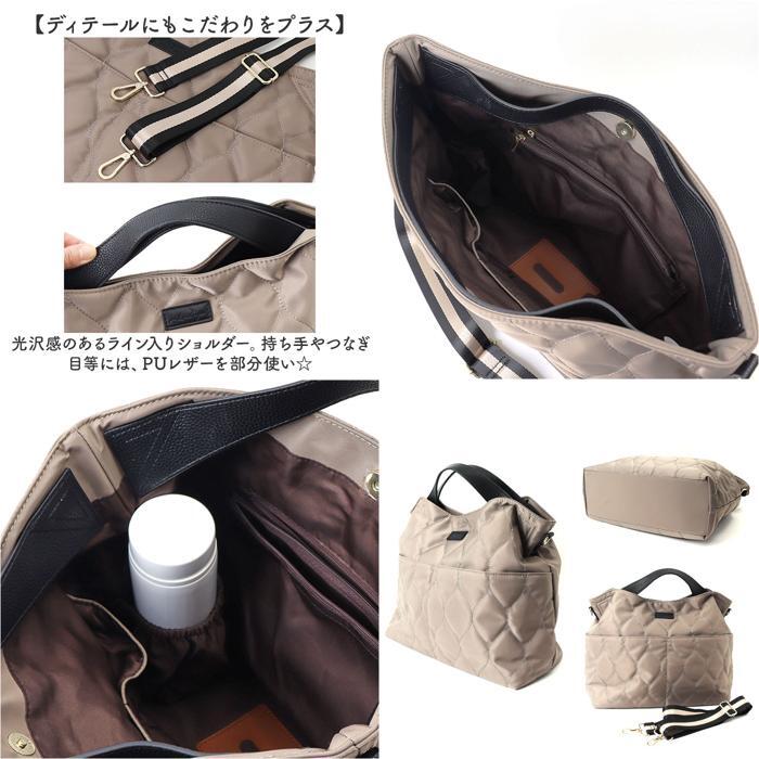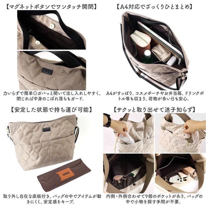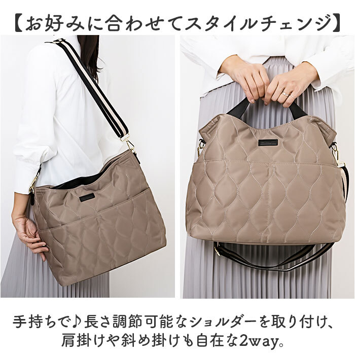 商品説明 | ・・【シーンを問わないお出かけの味方】 ・おしゃれに持ち歩けてヘビロテ♪「LIZDAYS キルティングナイロンショルダーバッグ」。 ・【使い勝手ばっちりな大人トート】 ・程よいくったりフォルムに、これ1つでお出かけできる収納力。オン・オフ問わず活躍◎ ・【お好みに合わせてスタイルチェンジ】 ・手持ちで♪長さ調節可能なショルダーを取り付け、肩掛けや斜め掛けも自在な2way。 ・【マグネットボタンでワンタッチ開閉】 ・力いらずで簡単◎ガバっと開いて出し入れしやすく、閉じれば中身のこぼれ落ちもガード。 ・【A4対応でざっくりひとまとめ】 ・A4がすっぽり。コスメポーチやお弁当箱、ドリンクボトル等も収まり、荷物が多い日も安心。 ・【安定した状態で持ち運び可能】 ・取り外し自在な底板付き。バッグの中でアイテムが動きにくく、安定感をキープ。 ・【サクッと取り出せて迷子知らず】 ・内側・外側合わせて9個のポケットがあり、バッグの中で小物を探す手間が不要。 ・【改札もスムーズにタッチ&ゴー】 ・さらに底板にはICカードポケット付。ICカードを入れて、バッグの底を改札機にかざすだけ! ・【丈夫でキレイなフォルムをキープ】 ・耐久性のある高密度ナイロンを使用。崩れしにくく、ガシガシ使えるのが嬉しい! ・【ちょっとの雨なら大丈夫】 ・表面は汚れや水滴を弾きやすい、撥水加工済み。お手入れも拭き取るだけ。 ・(※)完全防水ではありません。 ・【上品な印象のキルティングデザイン】 ・落ち着きのあるカラーに、ふっくらキルティング♪どんなコーデにも素敵にマッチ。 ・【ディテールにもこだわりをプラス】 ・光沢感のあるライン入りショルダー。持ち手やつなぎ目等には、PUレザーを部分使い☆ ・【ポケット仕様】 ・内側:ファスナーポケット×2、オープンポケット×3、ボトルポケット×1 ・前面:オープンポケット×2 ・背面:ファスナーポケット×1 ・底板:ICカードポケット×1 |