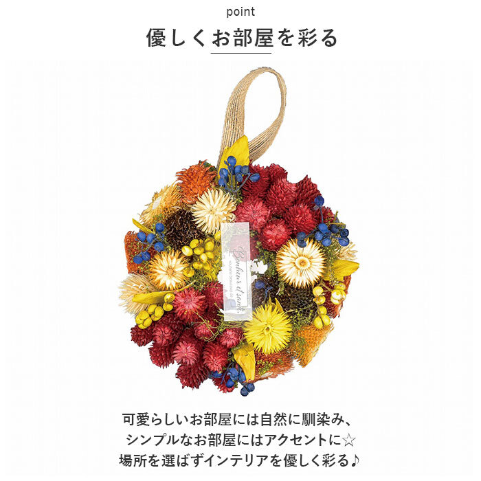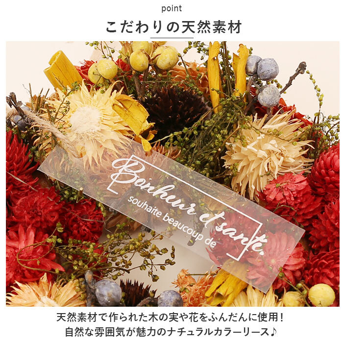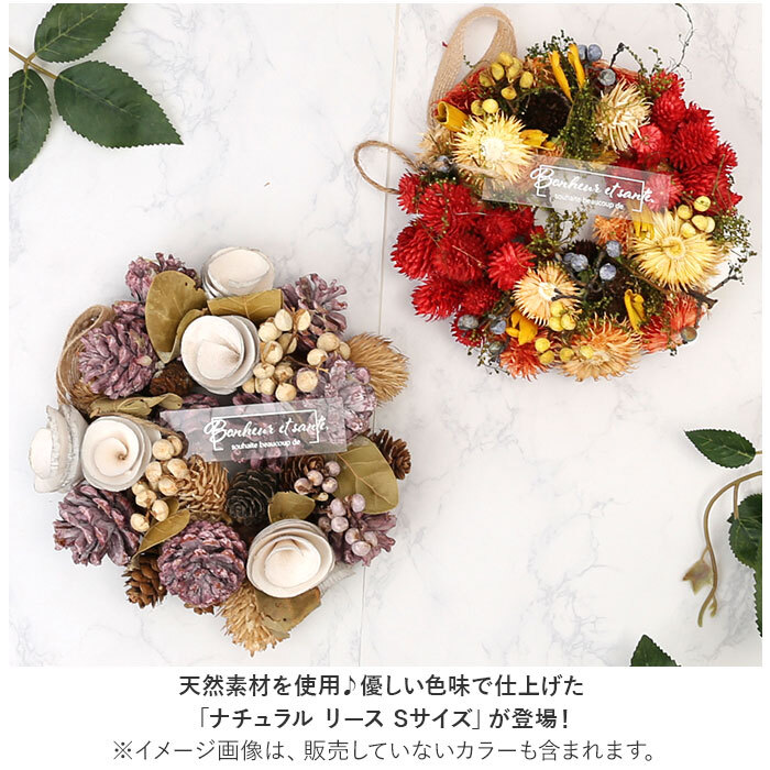 | 商品説明 | ・・天然素材を使用♪優しい色味で仕上げた「ナチュラル リース Sサイズ」が登場! ・【こだわりの天然素材】 ・天然素材で作られた木の実や花をふんだんに使用!自然な雰囲気が魅力のナチュラルカラーリース♪ ・【手軽にお花をインテリアに♪】 ・お手入れが大変な生花と違い、水やりなどのお世話が必要なく季節問わず装飾できるのが嬉しいポイント! ・【優しくお部屋を彩る】 ・可愛らしいお部屋には自然に馴染み、シンプルなお部屋にはアクセントに☆場所を選ばずインテリアを優しく彩る♪ ・【気軽に飾れるSサイズ】 ・小ぶりなつくりのSサイズなので、トイレや玄関などの小さな空間でも気軽に飾れてGOOD◎ ・【専用BOX付】 ・英字新聞の梱包とオシャレなタグがチラッとのぞく専用BOX付きなので、大切な人への贈り物にもオススメ♪ |