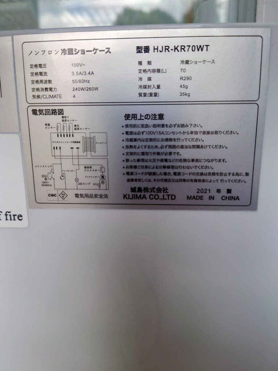 倉庫にて直接お引渡し可能となります♪ KIJIMA 冷蔵ショーケースの出品となります。 【詳細】 メーカー:KIJIMA 型番:HJR-KR70WT 年式:2021 電源:100V 【サイズ】(約) W: D: H: 【商品の状態】 used品 写真にてご判断お願いいたします 日焼け跡有り 【動作確認】 あり 【保証】 なし 【発送】 佐川急便、弊社提携便にて発送 | ||||||||||||||||