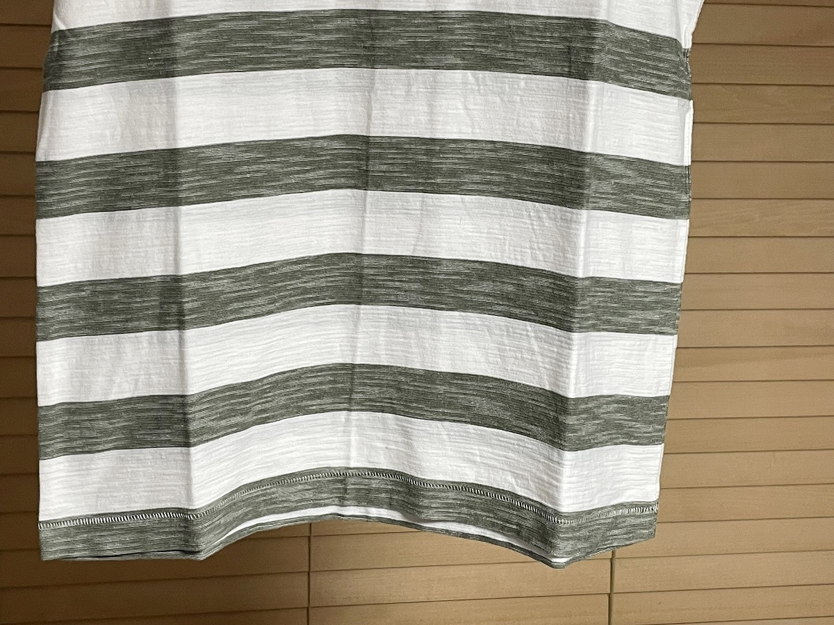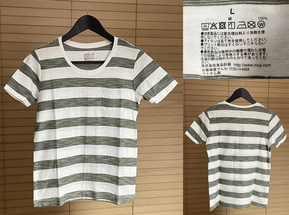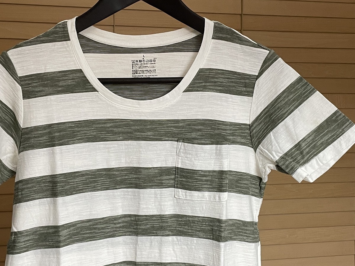 【激安1点のみ 国内正規品】無印良品 MUJl 天竺編み 胸ポケット ボーダー クルーネック 半袖 Tシャツ L ホワイト×グレーがかったカーキ系