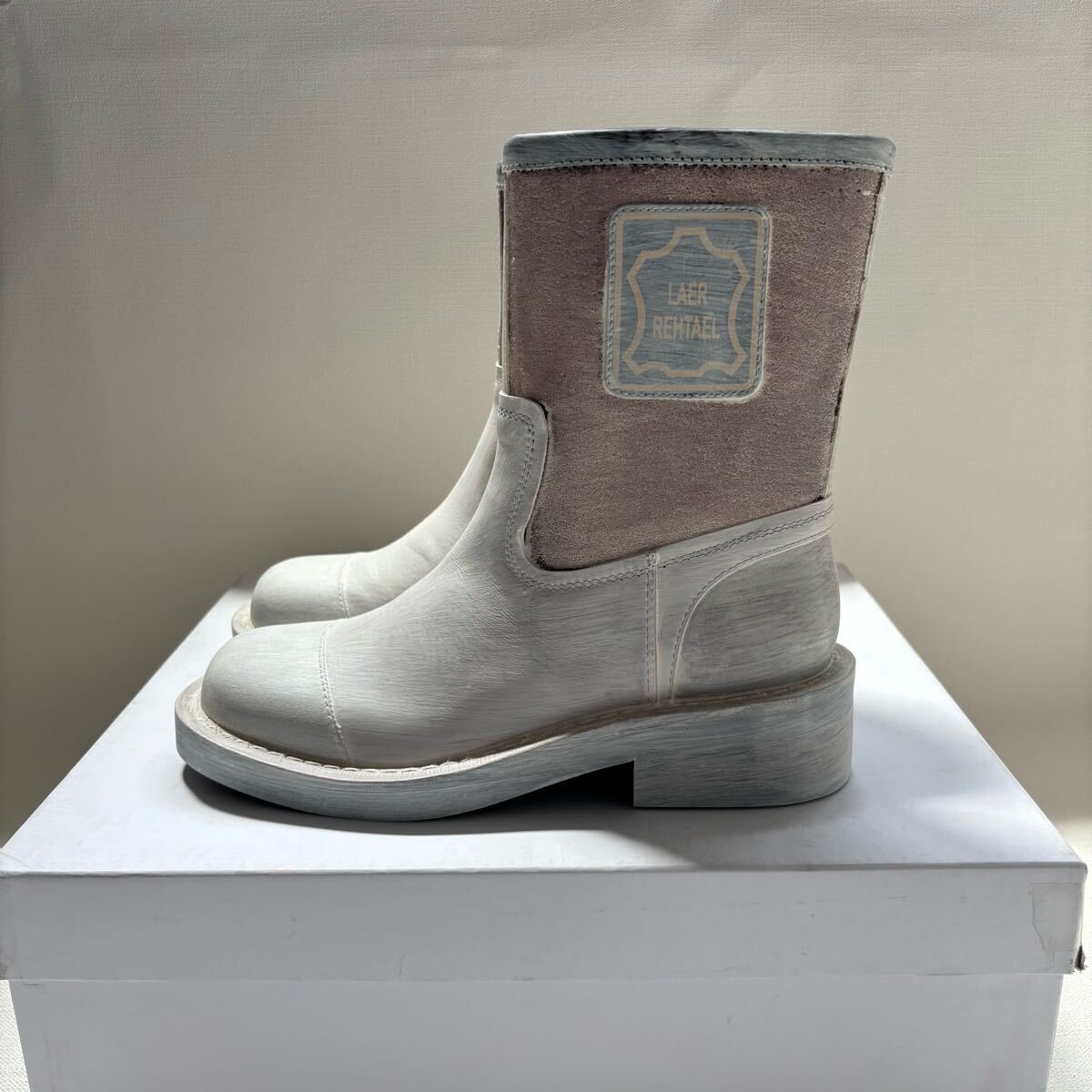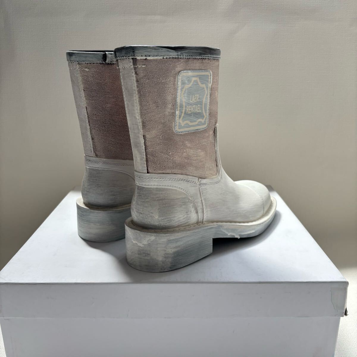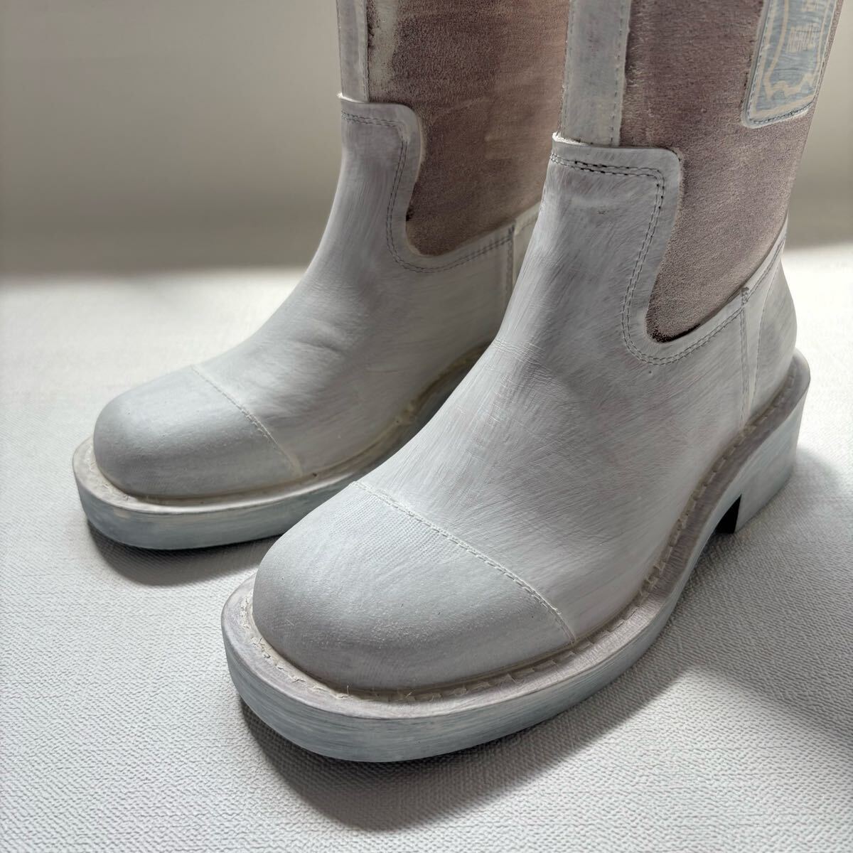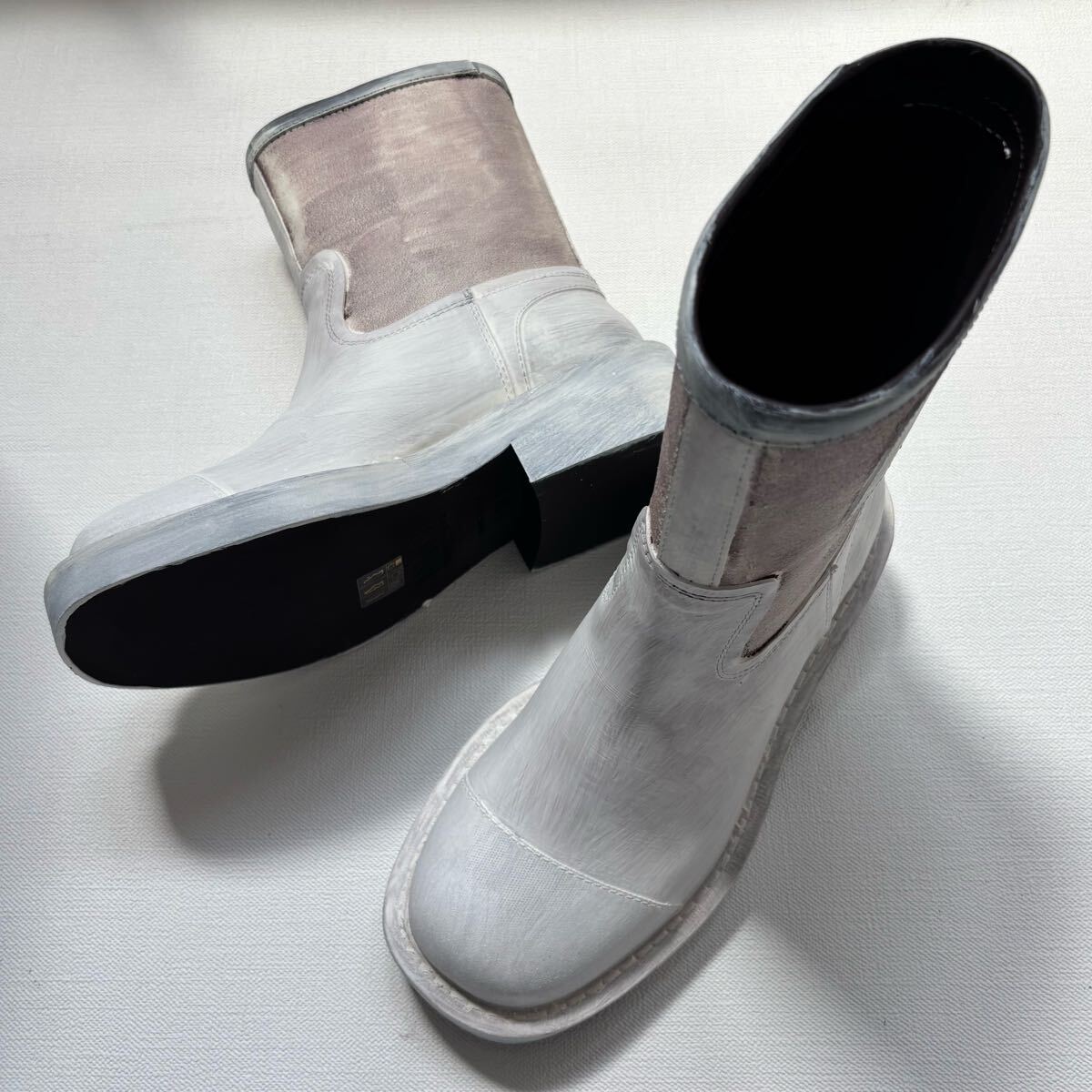 MM6の2021AWコレクションからランウェイでも目を引いたメゾンのリバースコンセプトを取り入れたインサイドアウト アンクル ブーツです。ホワイトペイントを施したビアンケット加工が施され、ホワイトのペンキは穿いていくごとにひび割れて剥がれていき、独自の経年変化を楽しめるマルジェラらしい仕様のモデルです。
