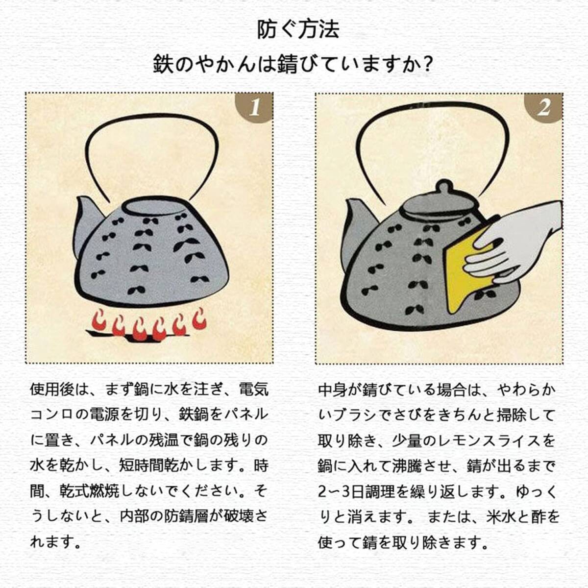 【鉄瓶サイズ】材質:鋳鉄。茶こし:ステンレス。鉄瓶源:ガス弱火、直火(中火以下)、電気コンロ、炭火、IH調理器対応できます。
